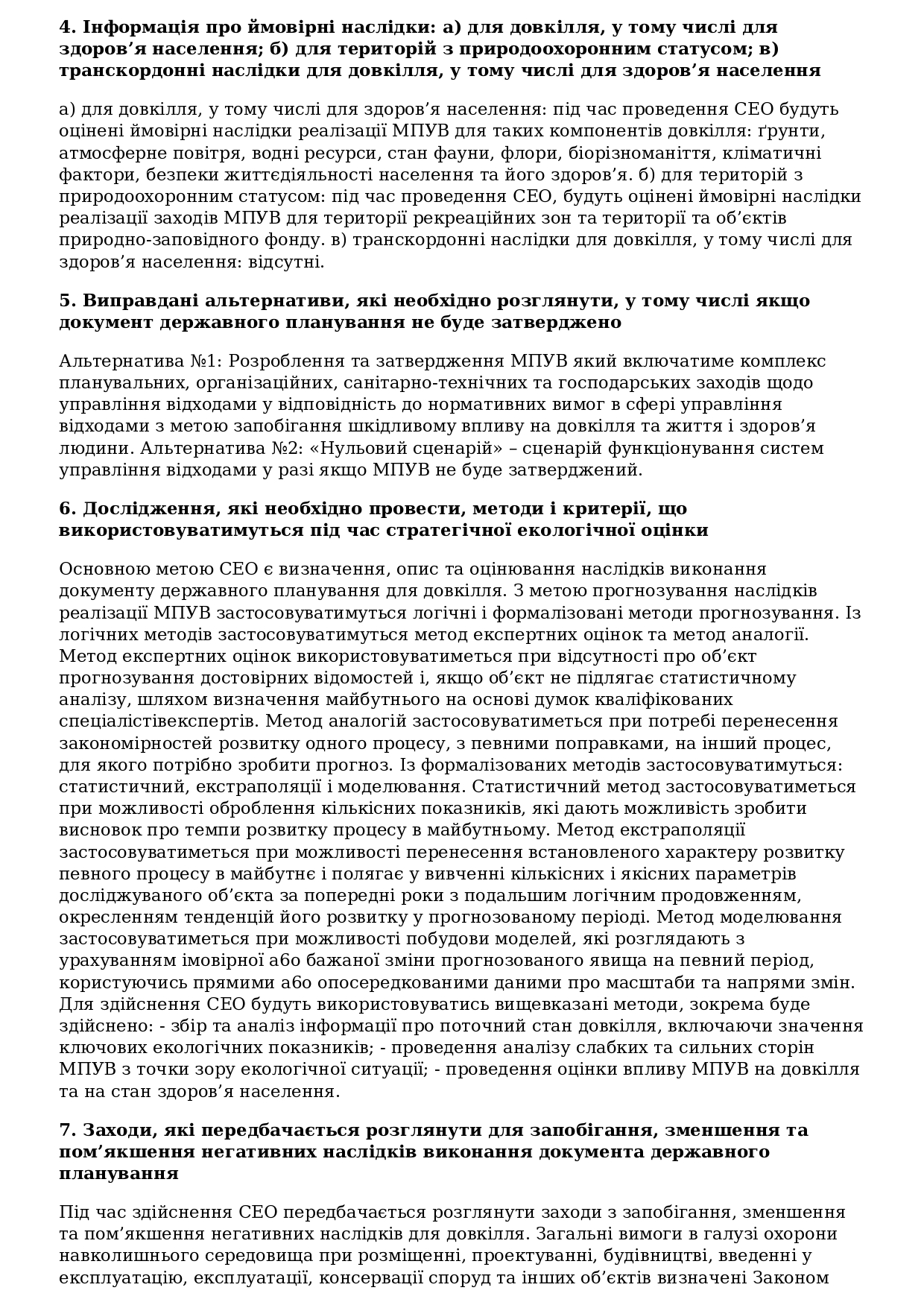 а) для довкілля, у тому числі для здоров’я населення: під час проведення СЕО будуть оцінені ймовірні наслідки реалізації МПУВ для таких компонентів довкілля: ґрунти, атмосферне повітря, водні ресурси, стан фауни, флори, біорізноманіття, кліматичні фактори, безпеки життєдіяльності населення та його здоров’я. б) для територій з природоохоронним статусом: під час проведення СЕО, будуть оцінені ймовірні наслідки реалізації заходів МПУВ для території рекреаційних зон та території та об’єктів природно-заповідного фонду. в) транскордонні наслідки для довкілля, у тому числі для здоров’я населення: відсутні.