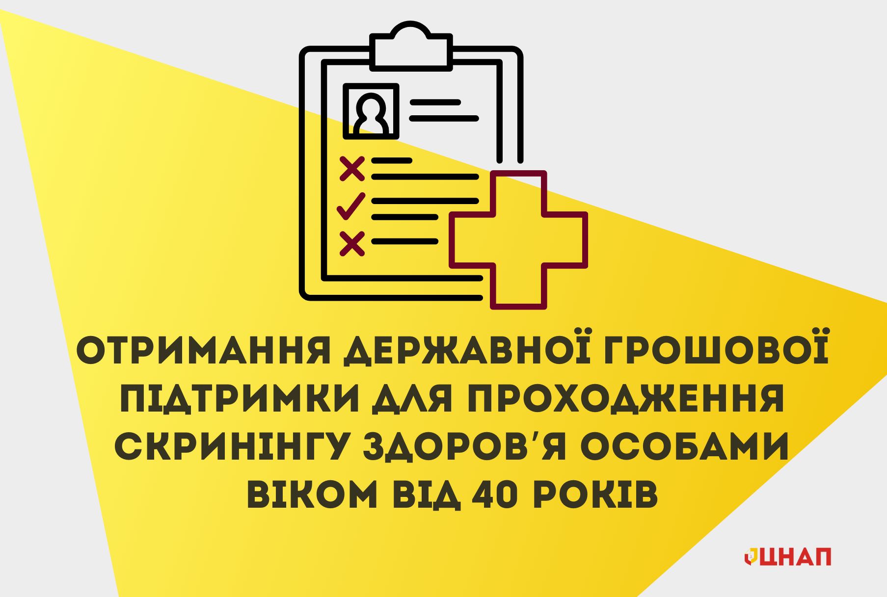 Повідомляємо, що на виконання постанови Кабінету Міністрів України від 10 грудня 2025 року № 1652 «Деякі питання проведення скринінгів здоров’я для осіб віком від 40 років» в головному офісі ЦНАПу (вул. Косовська, 2д) розпочато прийом документів з отримання грошової підтримки у розмірі 2000 грн. в рамках реалізації даного проєкту.