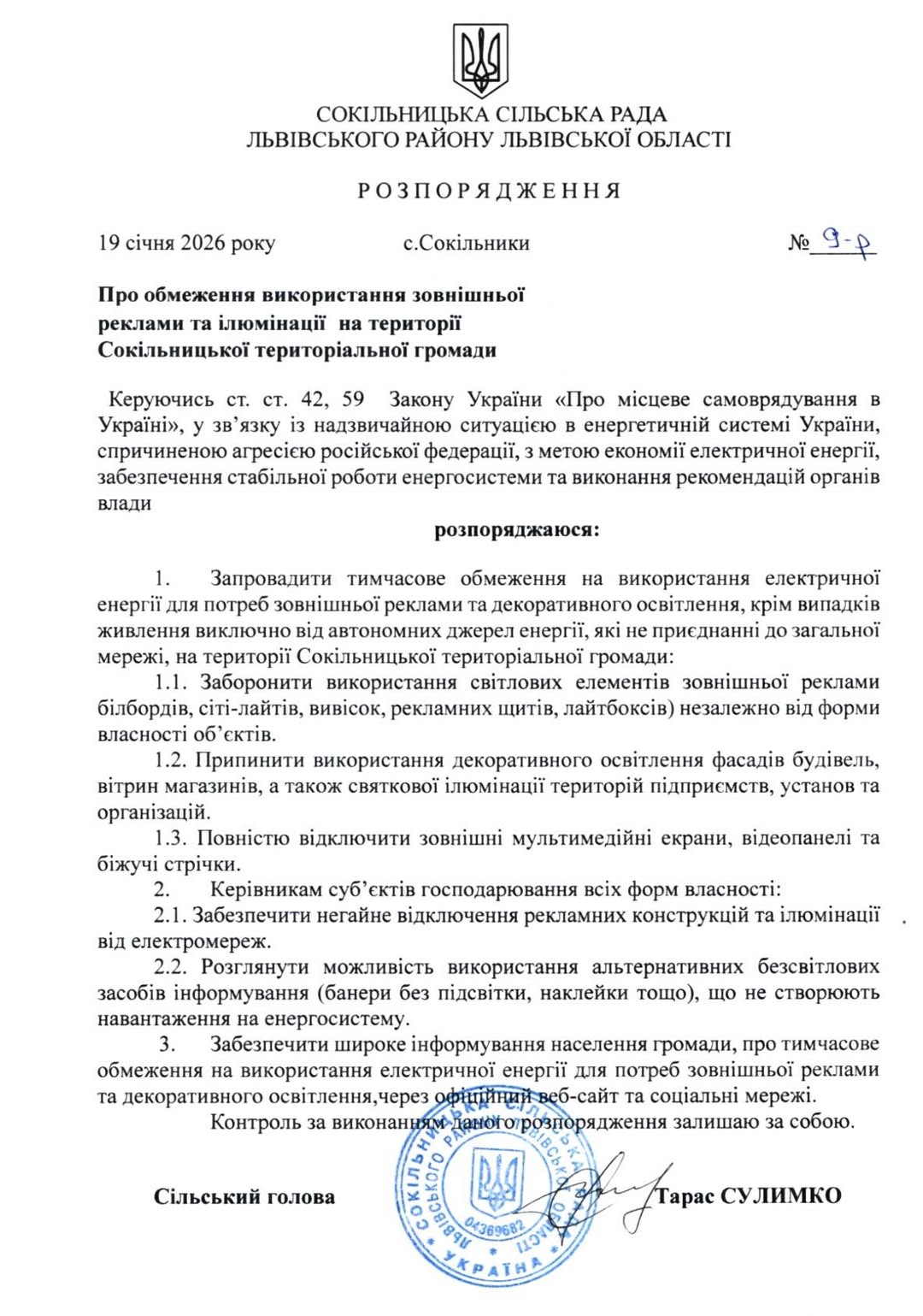 Повідомляємо, що на території Сокільницької територіальної громади введено тимчасові обмеження на використання електричної енергії для потреб зовнішньої реклами та декоративного освітлення.