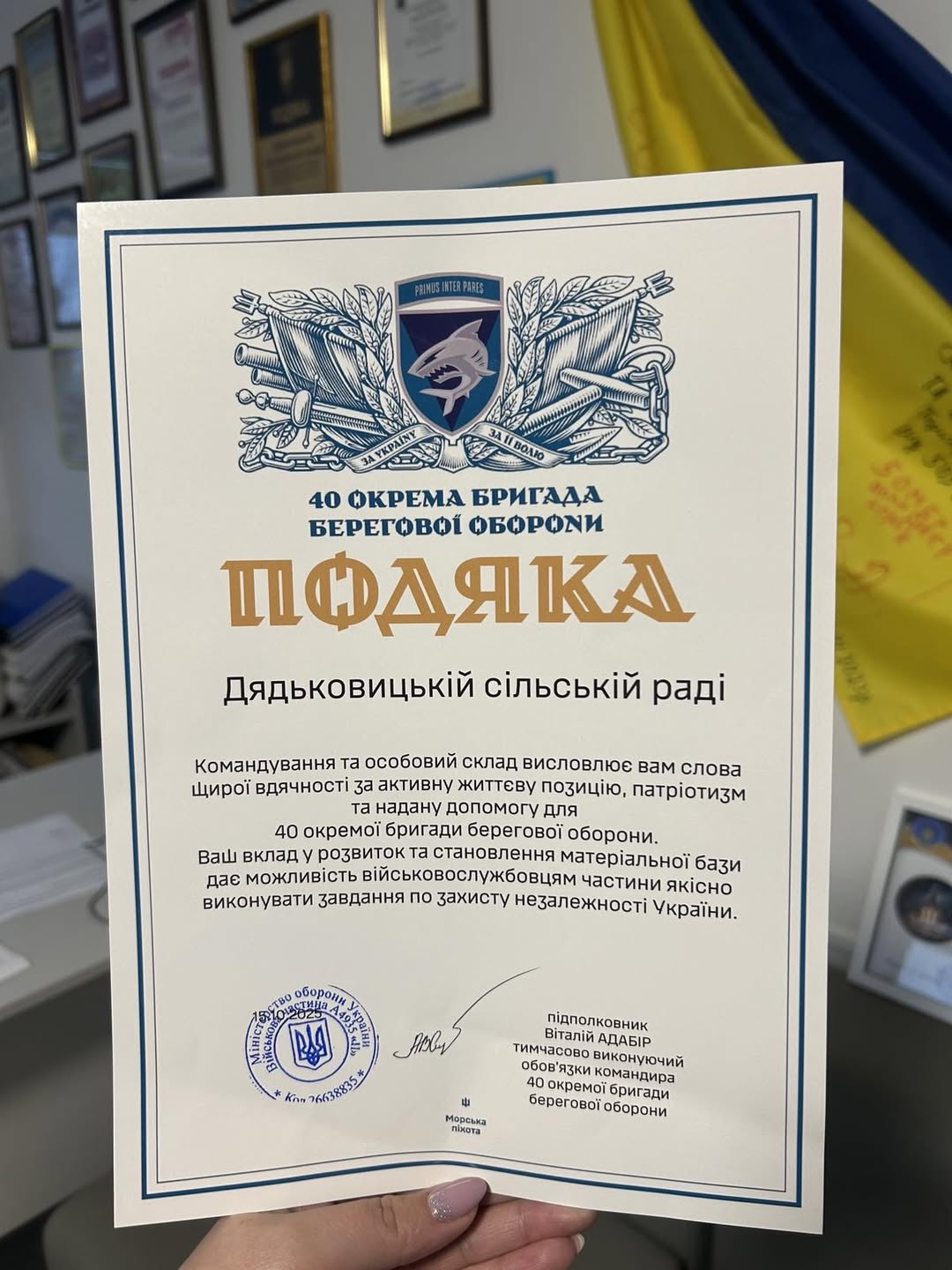 Дядьковицька громада отримала Подяку від 40 окремої бригади берегової оборони — як визнання нашої активної життєвої позиції, патріотизму та постійної підтримки українських захисників.