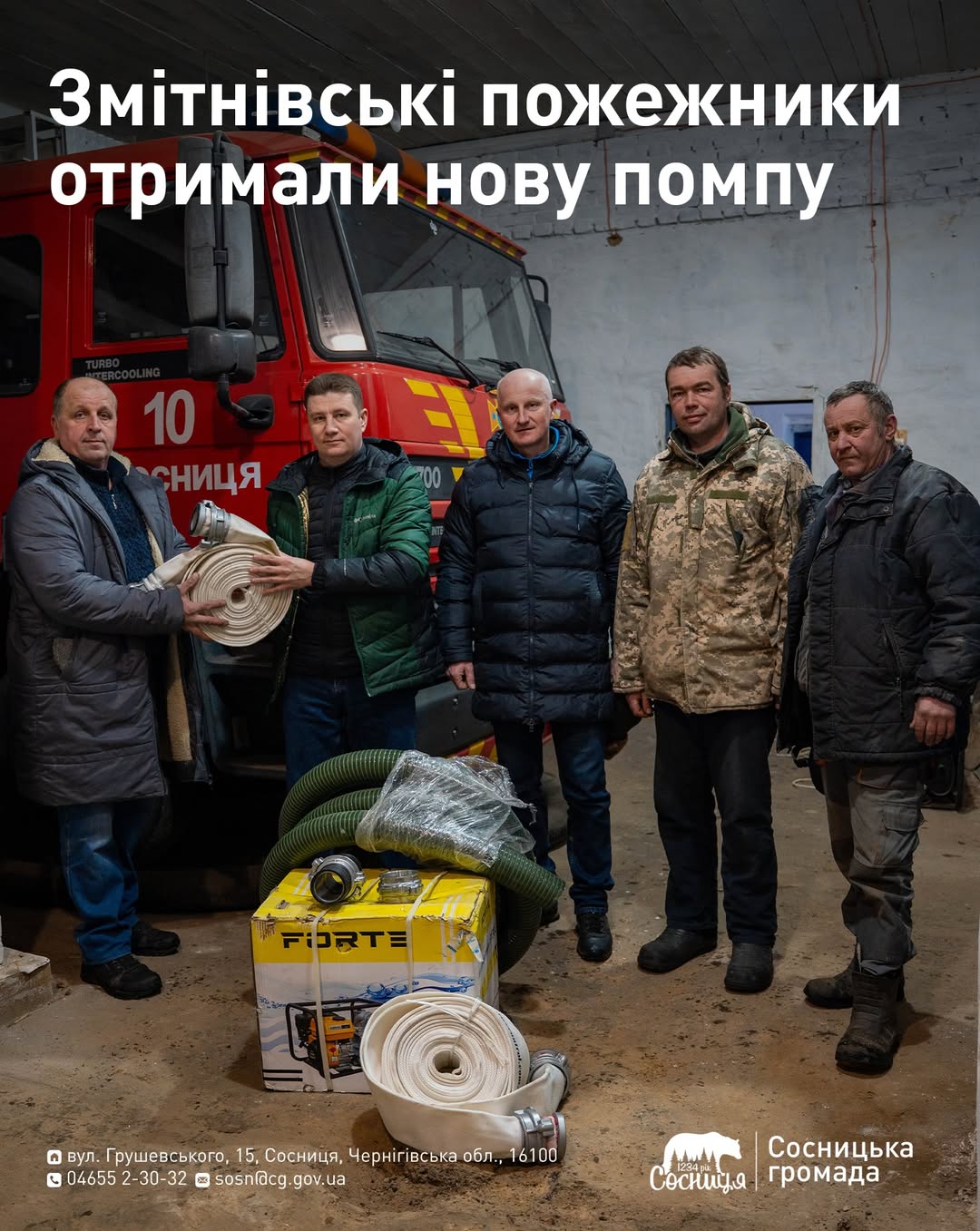Сосницька громада продовжує зміцнювати пожежну безпеку. Для змітнівських пожежників Південного старостату за кошти місцевого бюджету придбали нову пожежну помпу з комплектуючими, що значно підвищить ефективність реагування на надзвичайні ситуації.