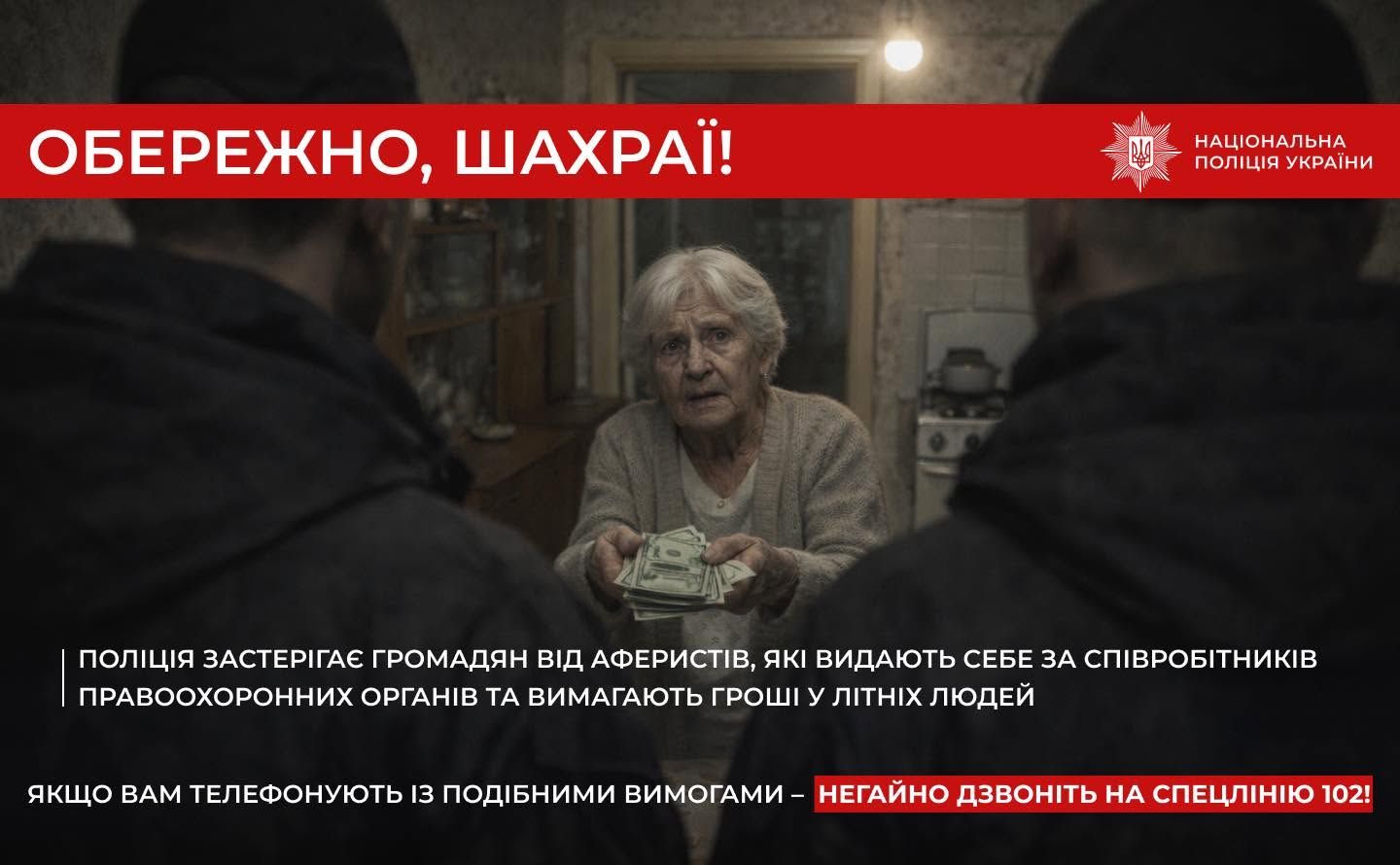 Якщо вам телефонує людина і представляється працівником силової структури звинувачуючи у злочині, а потім вимагає гроші – це шахрай! Повідомте про це якнайшвидше на спецлінію 102.