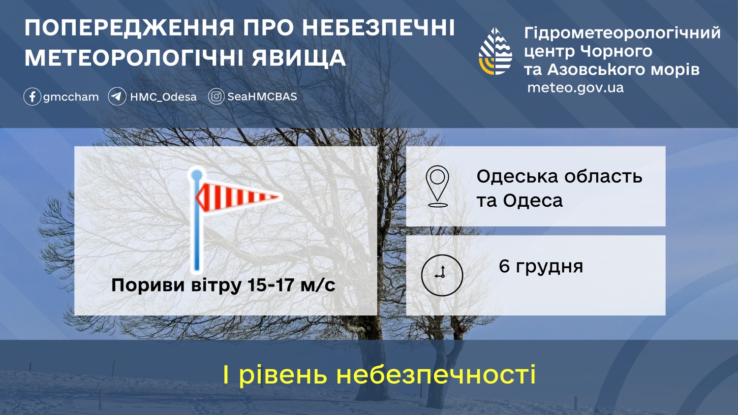 Протягом доби 6 грудня очікується вітер північно-східний, 15-17 м/с.
