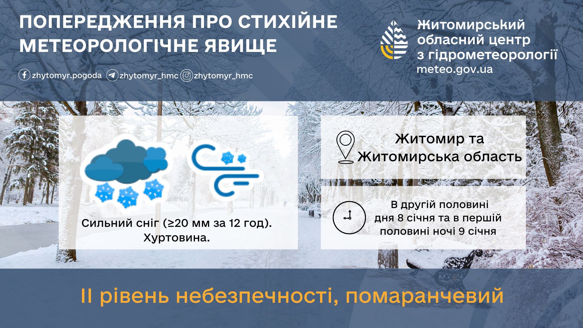 ‼️В другій половині дня 8 січня та в першій половині ночі 9 січня у Житомирській області та м. Житомирі сильний сніг (≥20 мм за 12 годин). Хуртовина. (ІІ рівень небезпечності – помаранчевий🟠).