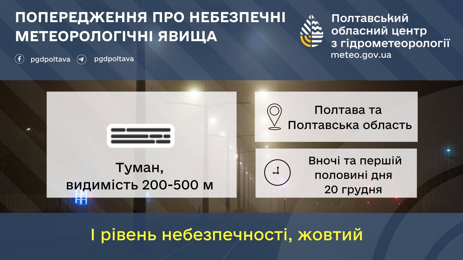 ❗️Попередження про небезпечні метеорологічні явища по Полтавській області та м.Полтава Вночі та першій половині дня 20 грудня 2025 року туман, видимість 200-500м.