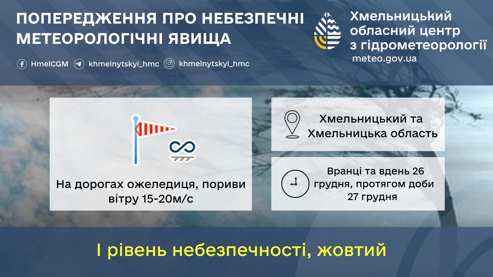 Вранці та вдень 26 грудня, протягом доби 27 грудня на дорогах ожеледиця, пориви вітру 15-20 м/с (І рівень небезпечності, жовтий)🟡