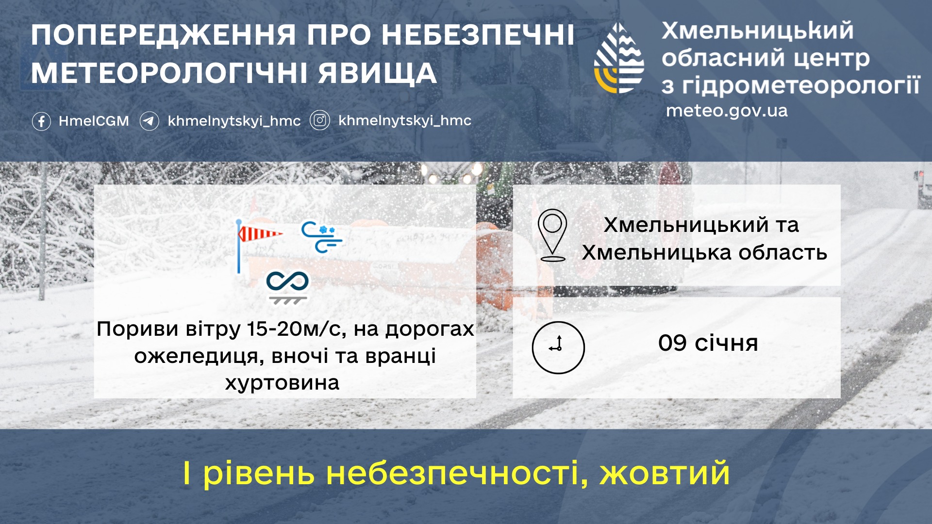 09 січня пориви вітру 15-20 м/с, на дорогах ожеледиця, вночі та вранці хуртовина (І рівень небезпечності, жовтий🟡).