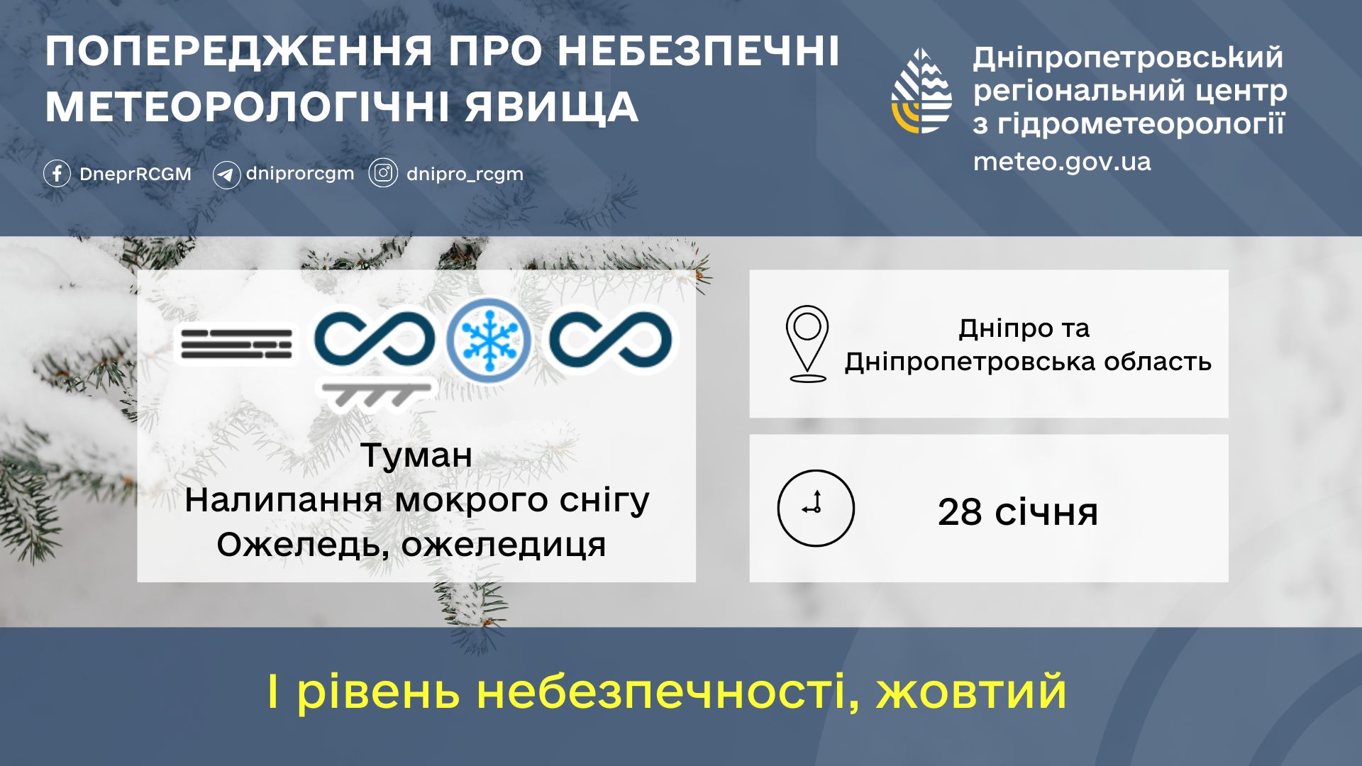 28 січня вночі та в першій половині дня по м. Дніпро та по Дніпропетровській області очікується туман (видимість в тумані 200-500 м), ожеледь (6-19 мм), налипання мокрого снігу (11-34 мм).