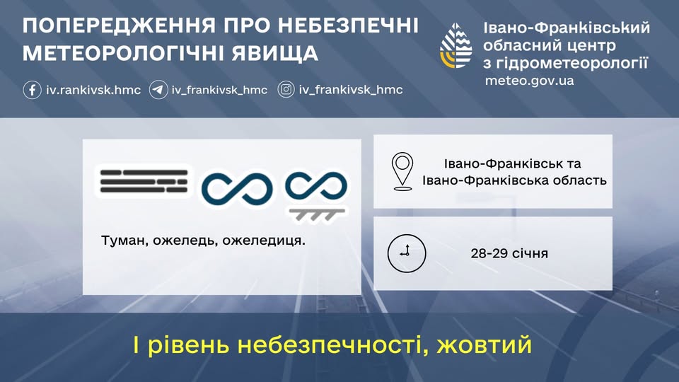 До кінця дня 28 січня, вночі та вранці 29 січня туман (видимість 100-500 м), ожеледь. Протягом доби 29 січня по місту Івано-Франківську та області на дорогах ожеледиця. (1 рівень небезпечності, жовтий 🟡).