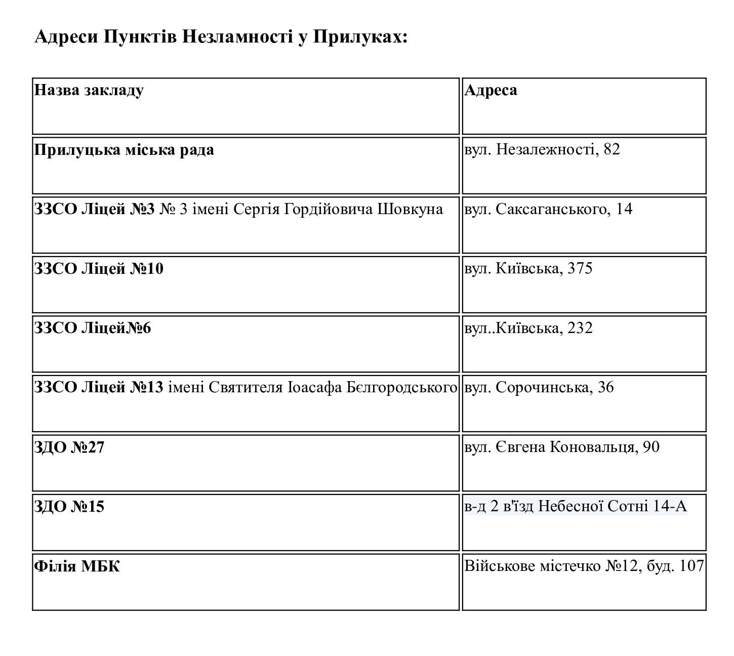 Усі зазначені пункти забезпечені необхідним обладнанням, генераторами та запасами води.