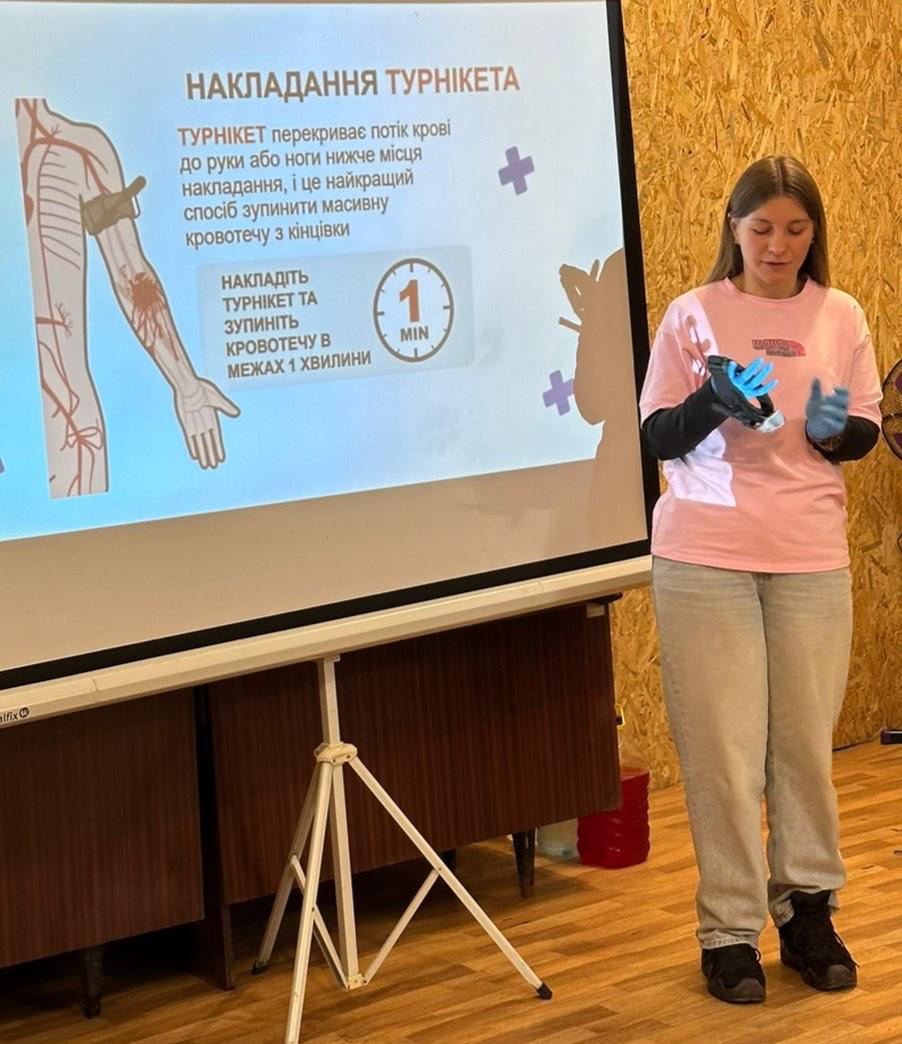 Під час занять учасники опановували надання домедичної допомоги в умовах підвищеної небезпеки – під час обстрілів, вибухів, масових уражень і бойових дій, коли стандартні алгоритми першої допомоги потребують адаптації. Вчилися, що робити в перші секунди після поранення, як зупиняти кровотечу, правильно користуватися турнікетами, накладати тиснучі пов’язки, проводити тампонаду, забезпечувати прохідність дихальних шляхів, діяти під час евакуації поранених, а також надавати первинну психологічну підтримку.