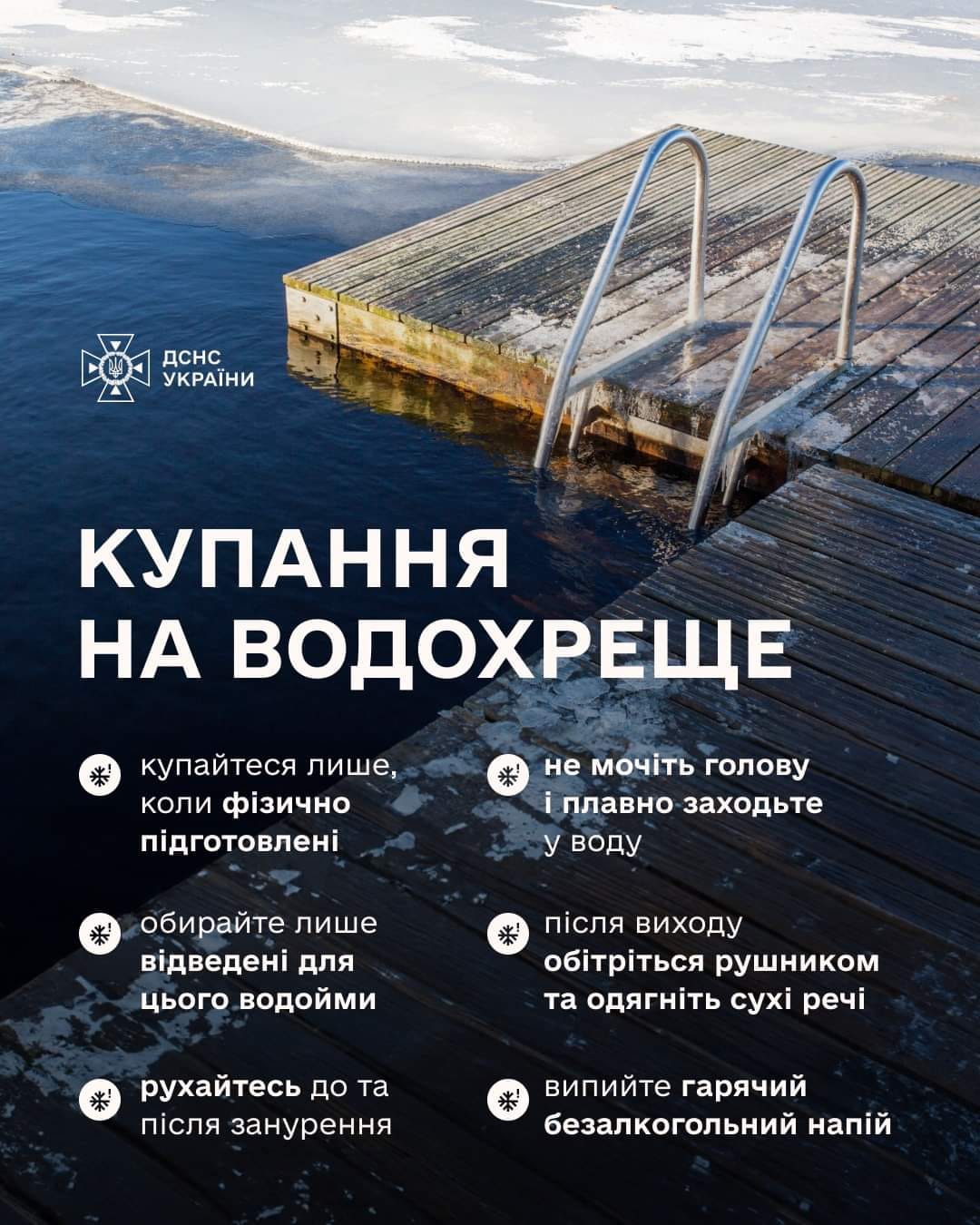 6 січня, в день свята Богоявлення (Водохреща), в Україні склалась традиція купання у відкритих водоймах, яка символізує очищення та оздоровлення. Проте, варто пам’ятати про дотримання правил безпеки, щоб уникнути надзвичайних подій та трагічних наслідків. Оскільки вода у річках та озерах холодна, для непідготовленої людини таке купання досить небезпечне. Тому, перш ніж зануритися у водойму, необхідно реально оцінити свої сили, можливості та стан здоров’я.