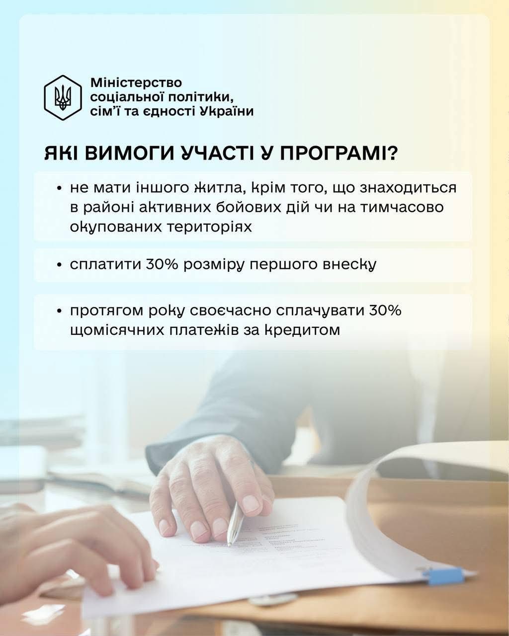 Умови участі у програмі прості – не мати іншого житла, крім того, що знаходиться в районі активних бойових дій чи на тимчасово окупованих територіях та працювати офіційно.