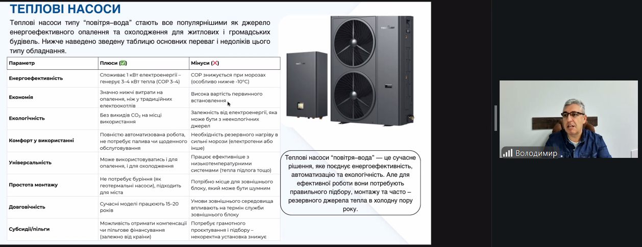 Володимир Кріль презентував порівняльну таблицю вартості опалення, яку забезпечують різні системи теплопостачання. Коротко розповів про головні характеристики тих, які ефективно використовують у будівлях комунальної власності українські муніципалітети.