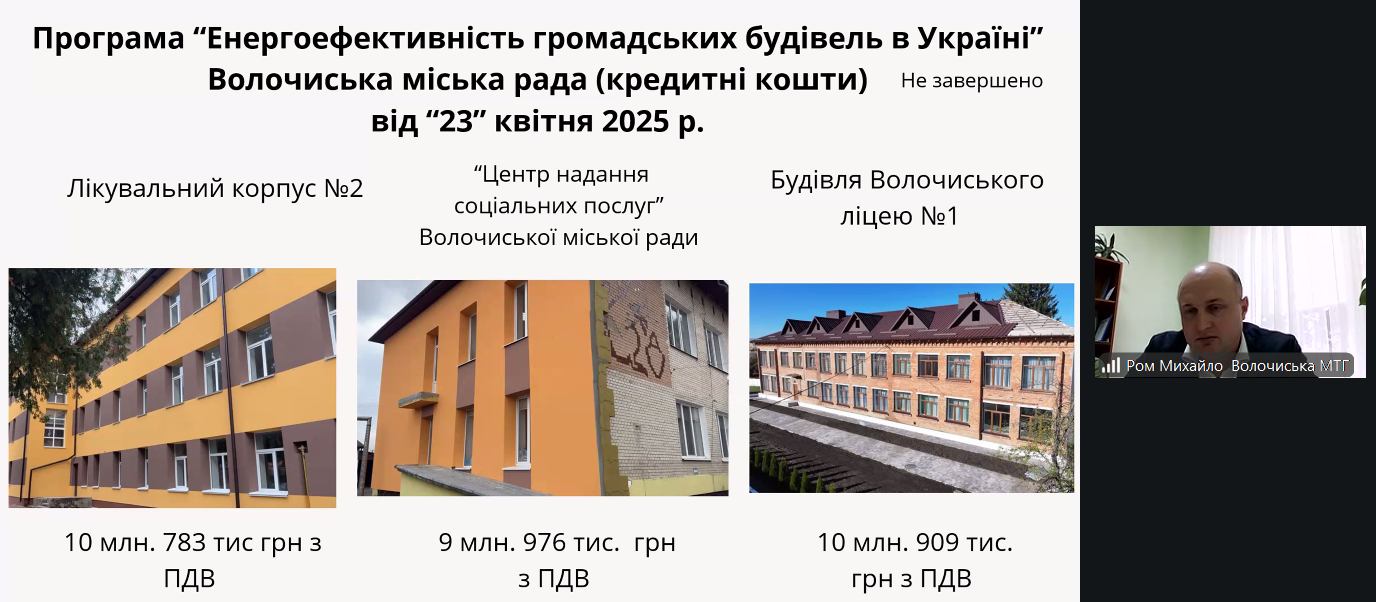Заступник міського голови Волочиська об’єднана територіальна громада Михайло Ром поділився позитивним досвідом утеплення шкіл у громаді. Зауваживши, що подекуди такі заходи дозволили досягнути економії на енергоносіях у 40%.