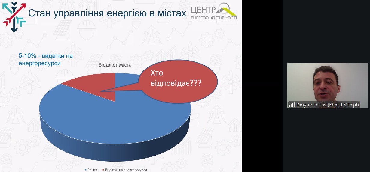 Власним досвідом впровадження енергоефективних заходів поділились із колегами представники громад Хмельниччини. Зокрема, начальник відділу енергоменеджменту Хмельницька міська рада Дмитро Леськів розповів про систему енергоменеджменту в обласному центрі. Колегам презентував успішний досвід міста щодо термомодернізації приміщень: утеплення, модернізація внутрішньо будинкових мереж і систем опалення, встановлення ІТП та інші заходи, які допомогли муніципалітету отримати реальні результати – енергоефективність та економію коштів громади.