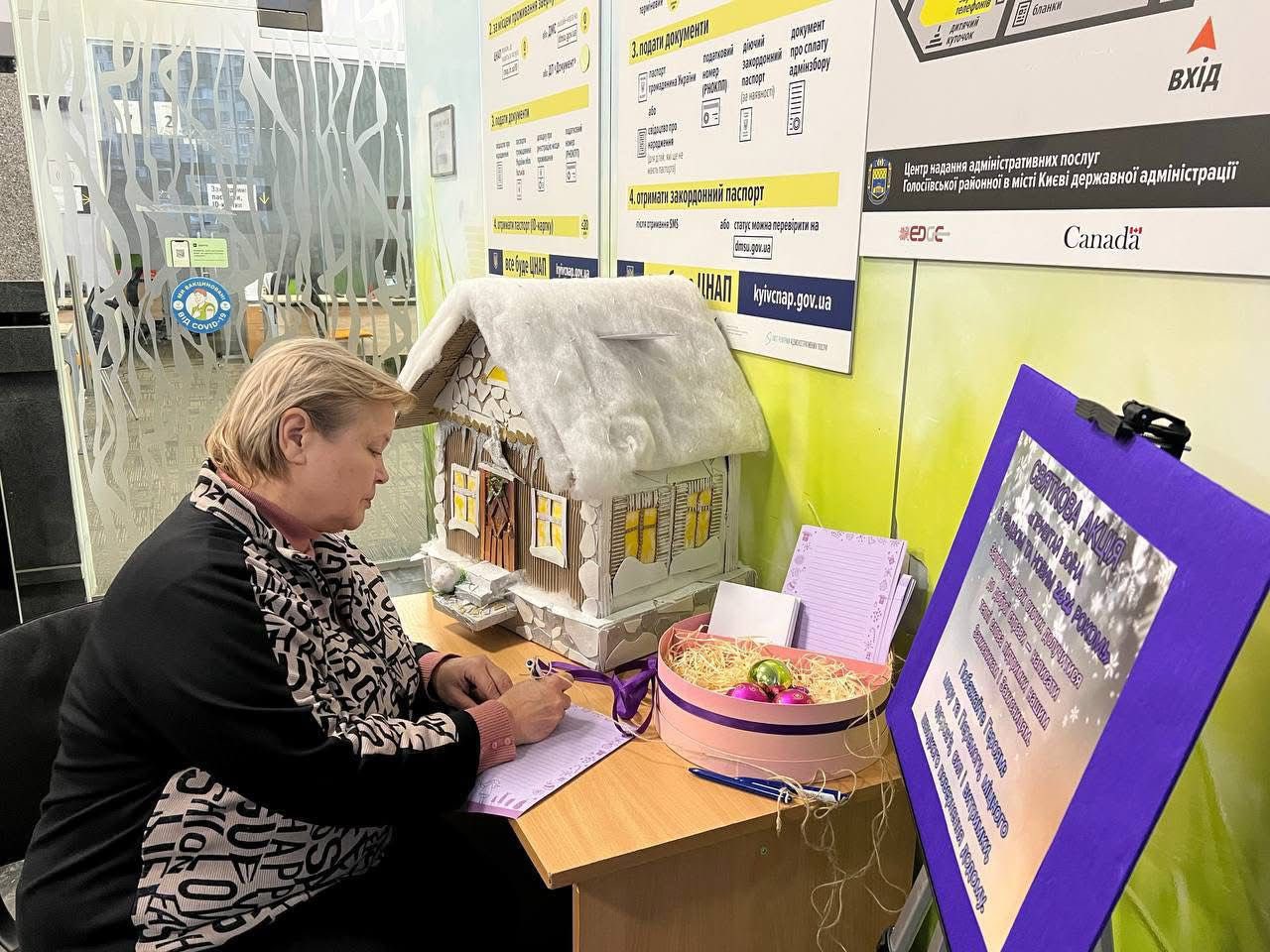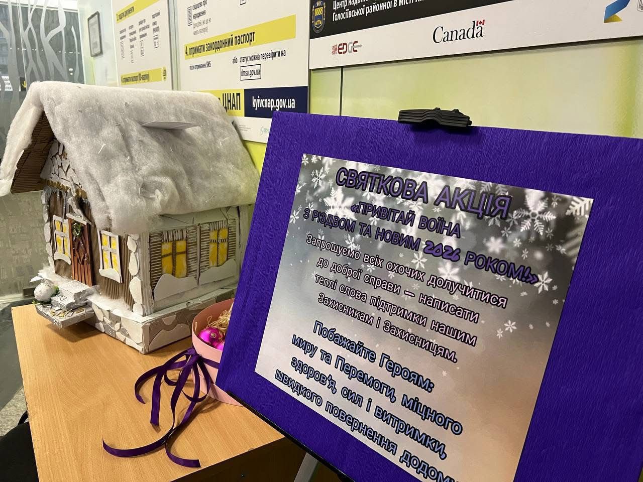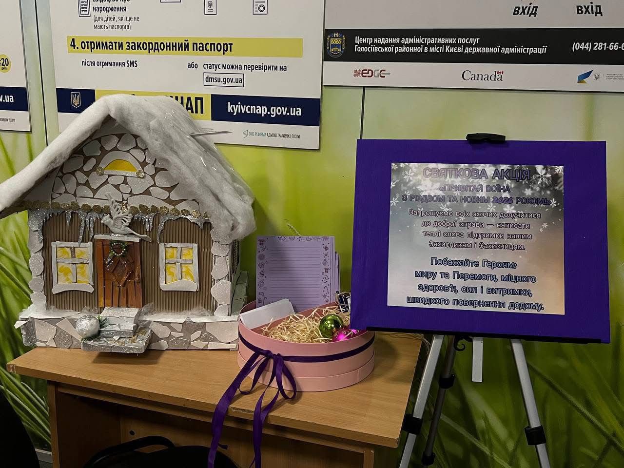 (проспект Голосіївський, 42) розміщена святкова експозиція, де кожен охочий може написати власну різдвяно-новорічну листівку, наповнену словами підтримки, віри та подяки нашим незламним Героям.
