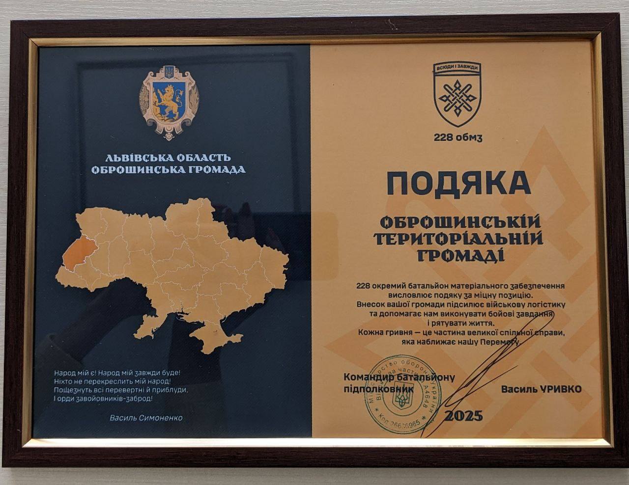 Разом з тим громада продовжує отримувати подяки від військових підрозділів. Зокрема, від 228 ОБМЗ отримано подяку та шеврон за підсилення батальйону та військової логістики.