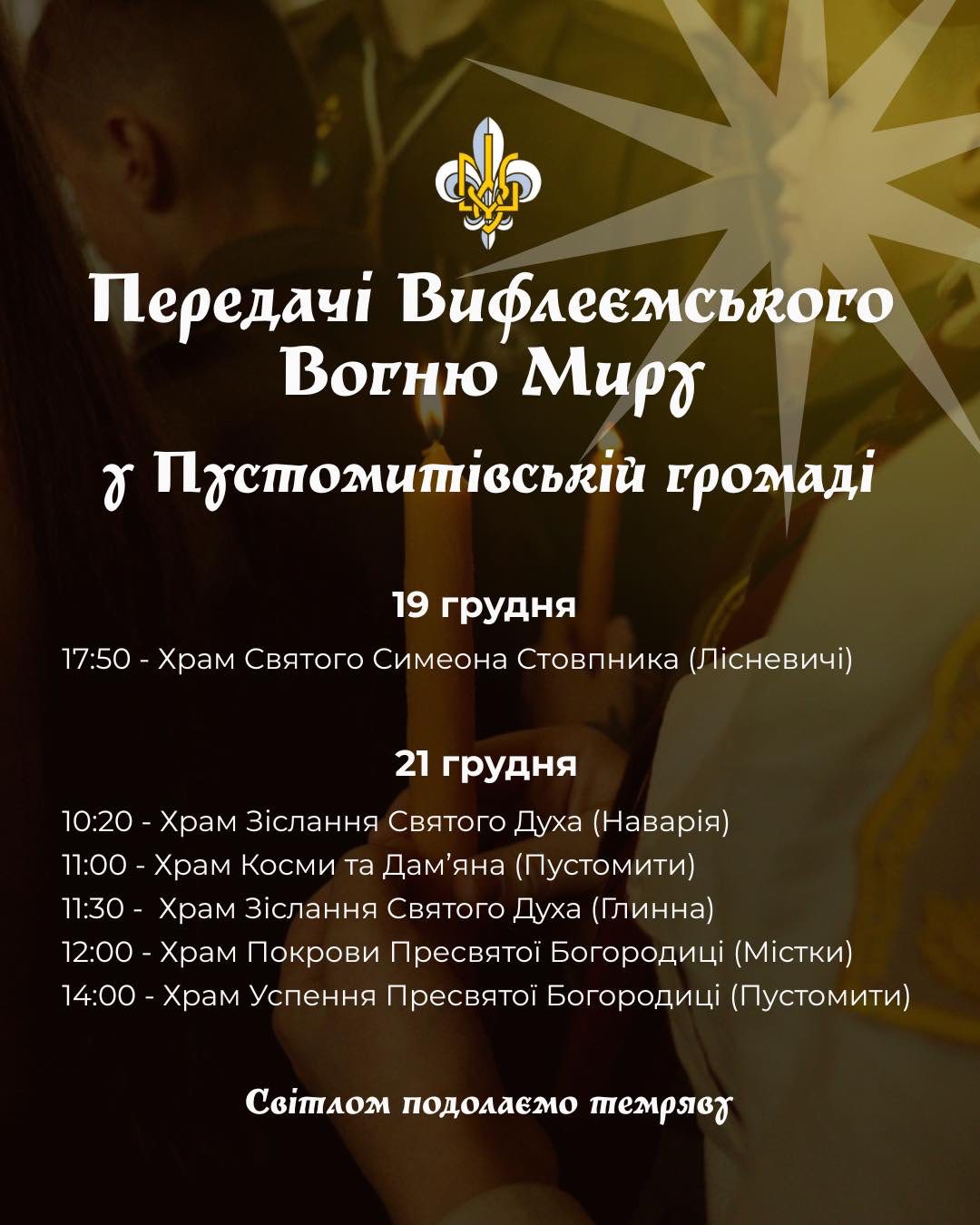 🌟Передача Вифлеємського Вогню Миру пластунами ПЛАСТ Пустомити у храмах нашої громади