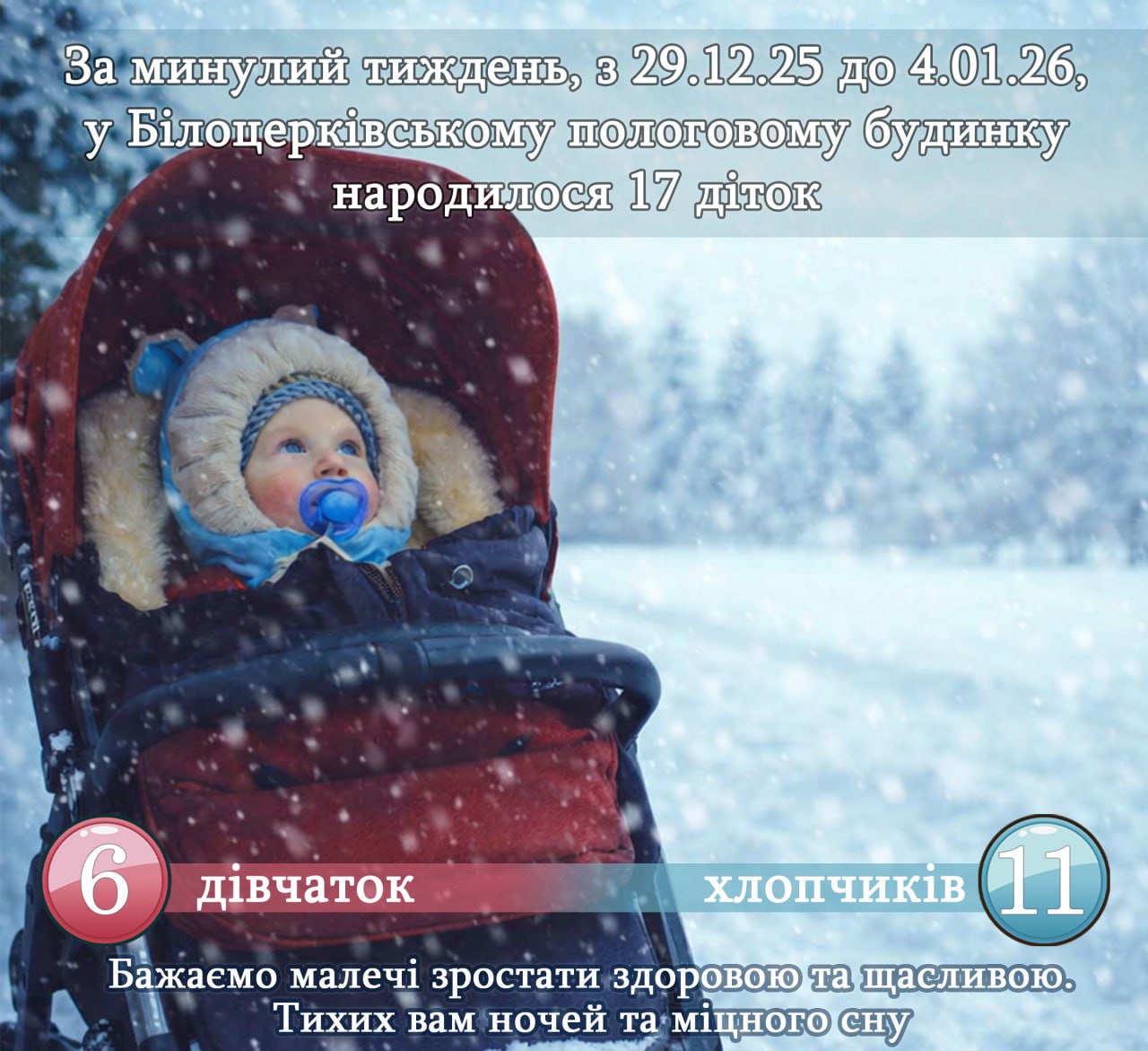 🎀💐Протягом минулого тижня, з 29 грудня 2025р. до 4 січня 2026р., у Білоцерківському пологовому будинку народилося 17 діток: