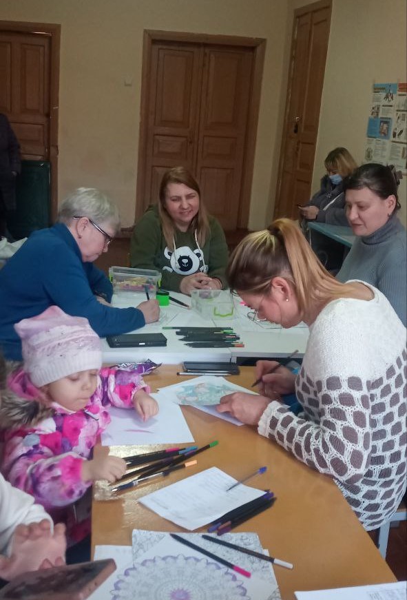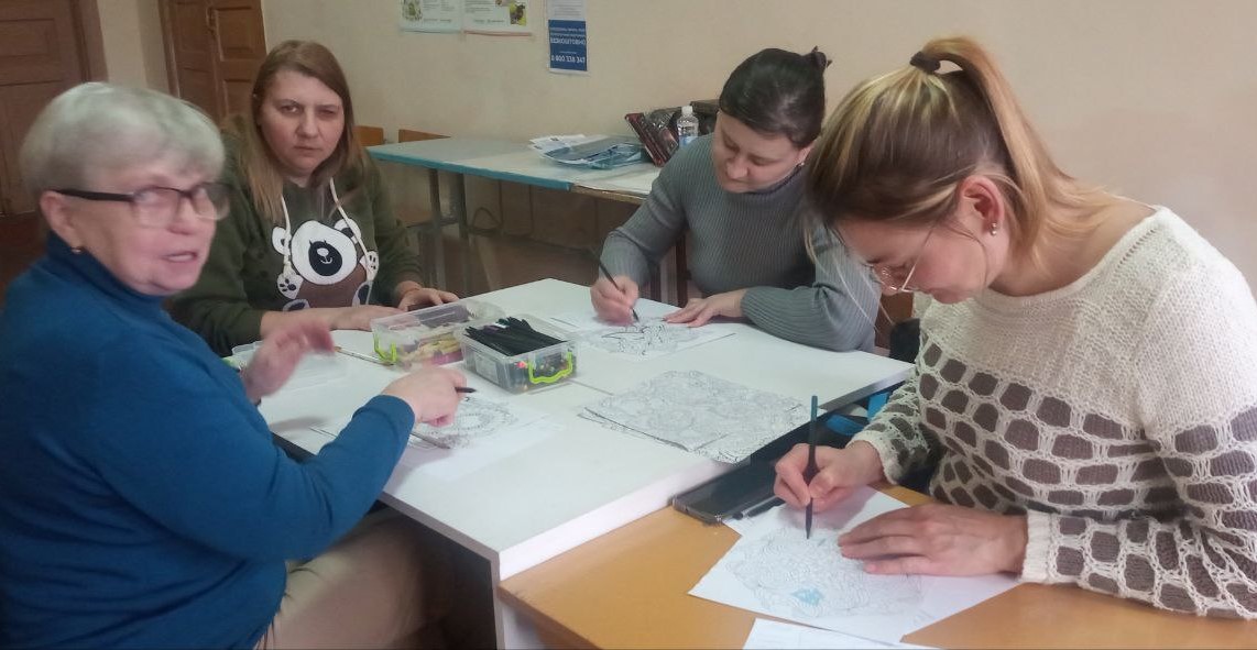 Для дорослих команда провела зустріч, присвячену темі стресу та шляхів його подолання. Учасники говорили про емоційне навантаження, ресурси відновлення та техніки самодопомоги, а розмальовки «Антистрес» допомогли кожному зосередитися, розслабитися та знайти внутрішній баланс.