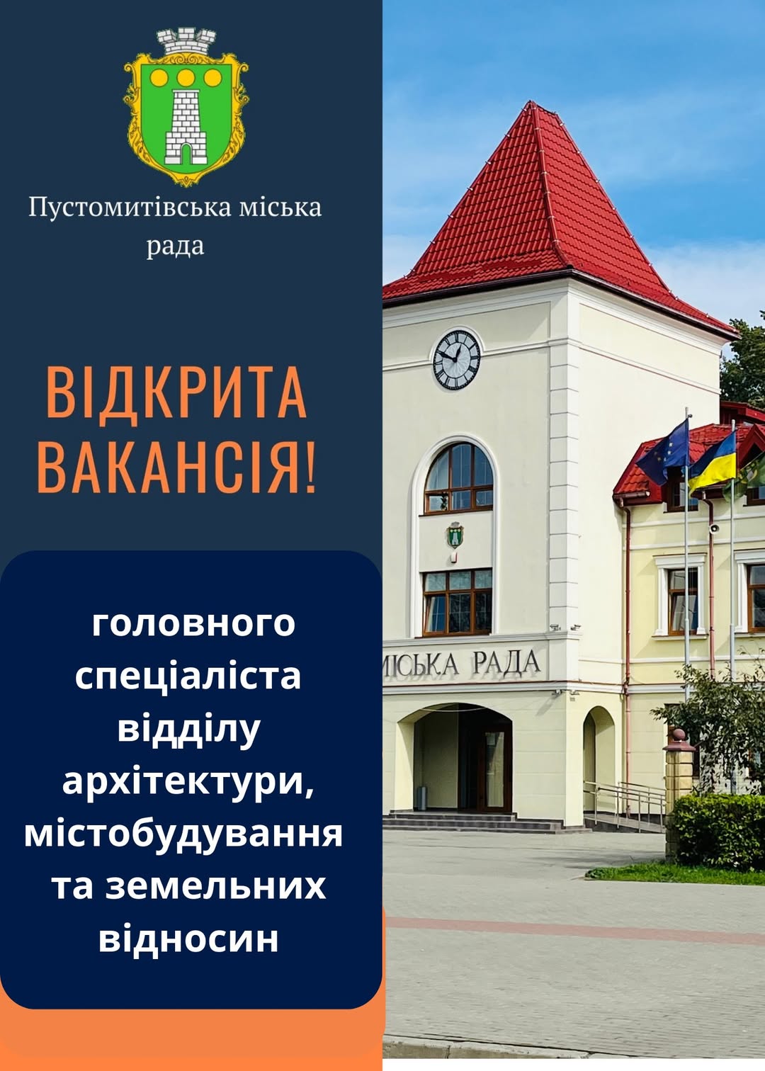 Пустомитівська міська рада оголошує конкурс на вакантну посаду: головного спеціаліста відділу архітектури, містобудування та земельних відносин.