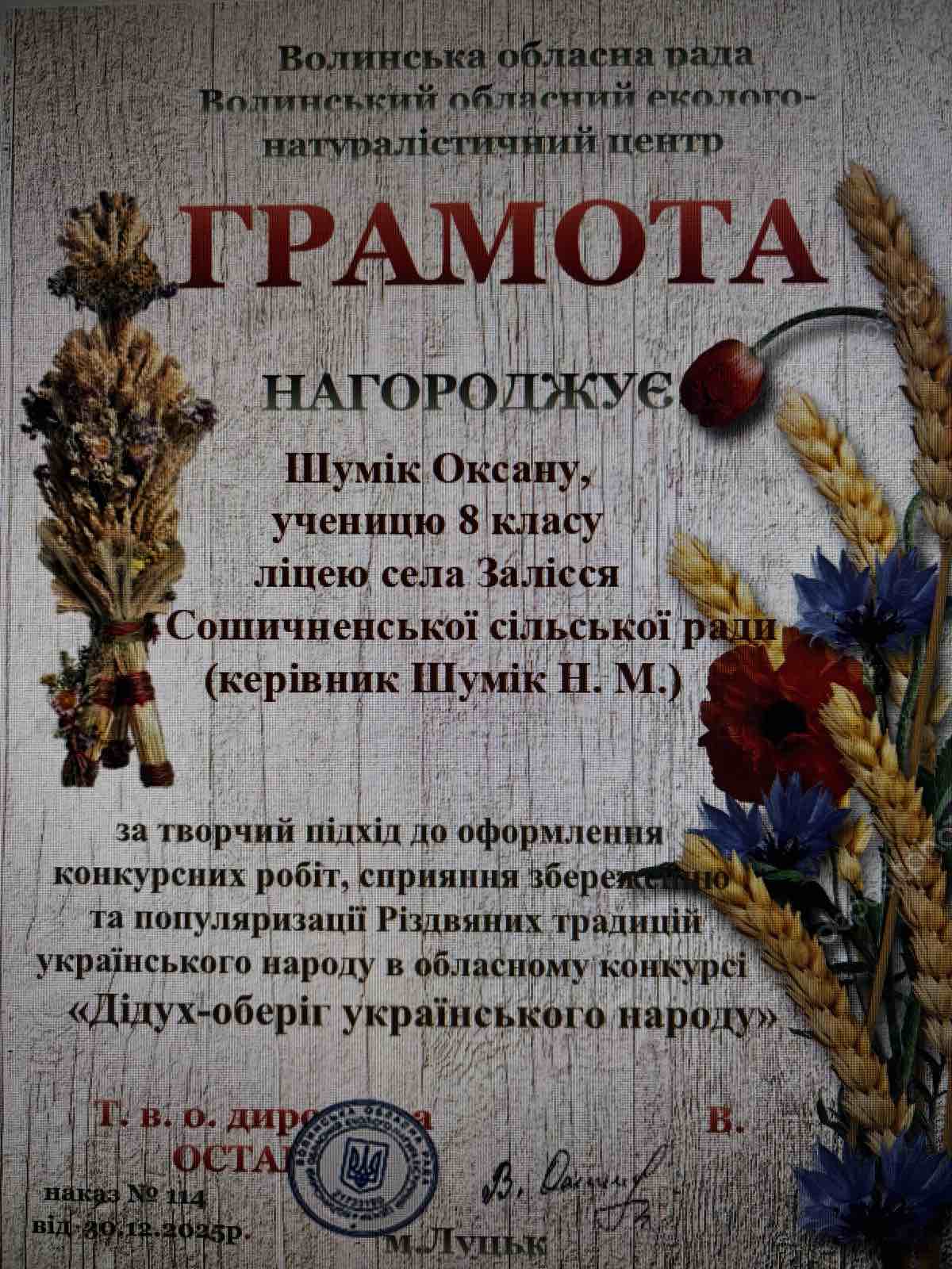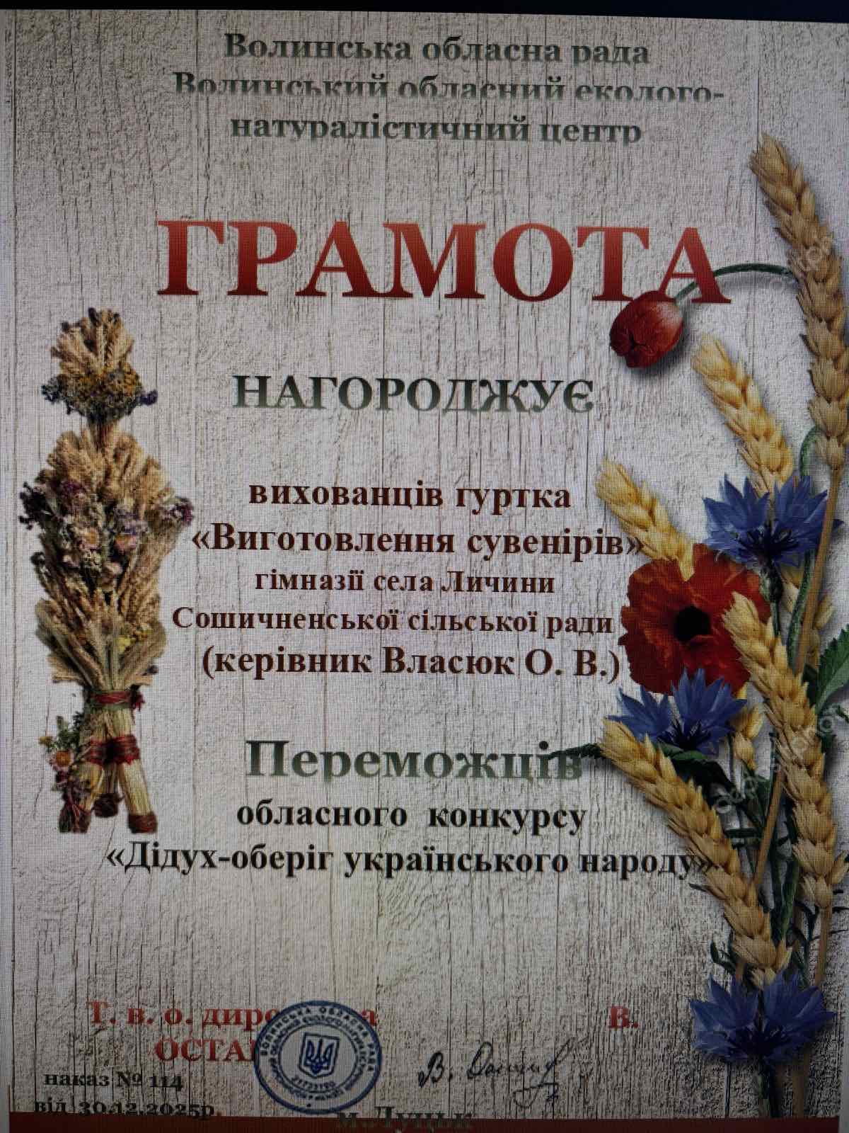 За результатами конкурсу переможцями стали вихованці гуртка «Виготовлення сувенірів» гімназії с. Личини Сошичненської сільської ради. Їхні роботи вирізнялися високим рівнем майстерності, оригінальністю та глибоким розумінням символіки дідуха. Щира подяка керівнику гуртка Власюк О.В. за професіоналізм, натхнення та плідну працю з дітьми.