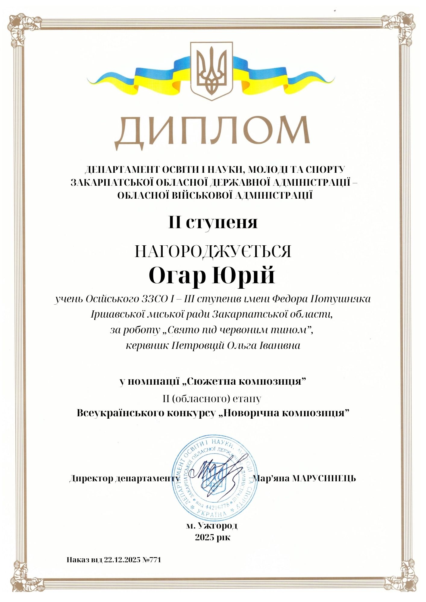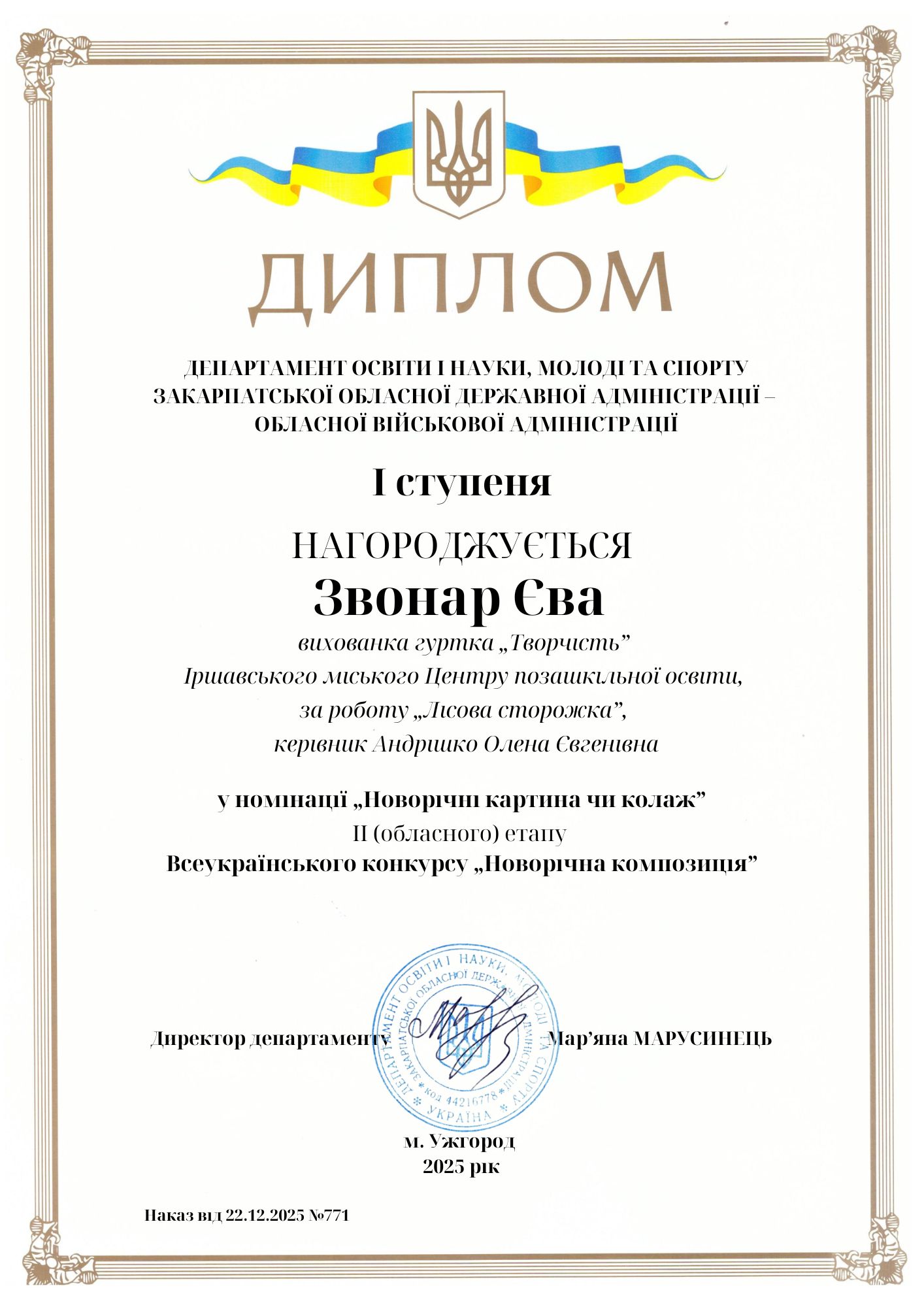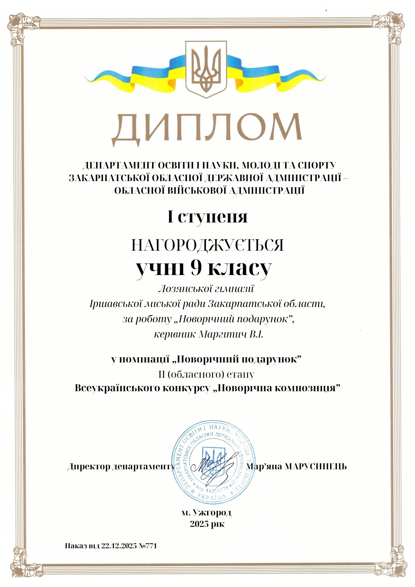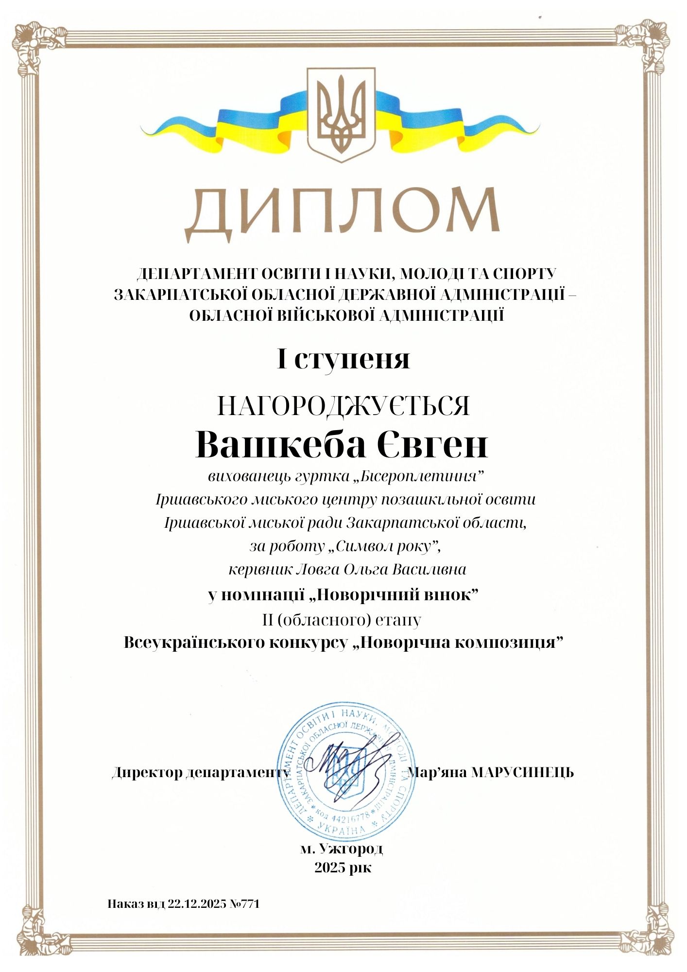 Підведено підсумки обласного етапу Всеукраїнської виставки-конкурсу «Новорічна композиція», який проходив у ПАДІЮНІ з 08 – 12 грудня минулого року. Цьогоріч на виставку-конкурс було представлено понад 540 дитячих робіт учнів закладів загальної середньої, позашкільної та професійно-технічної освіти області. Іршавська громада представила на конкурс 8 робіт, переможців міського етапу конкурсу. Отже, згідно наказу Департаменту освіти і науки Закарпатської ОДА від 22.12. 2025 року №771 «Про підсумки ІІ (обласного) етапу конкурсу «Новорічна композиція» з представлених робіт у 7 номінаціях вихованці МЦПО та здобувачі освіти закладів загальної середньої освіти та гімназій мають такі результати: