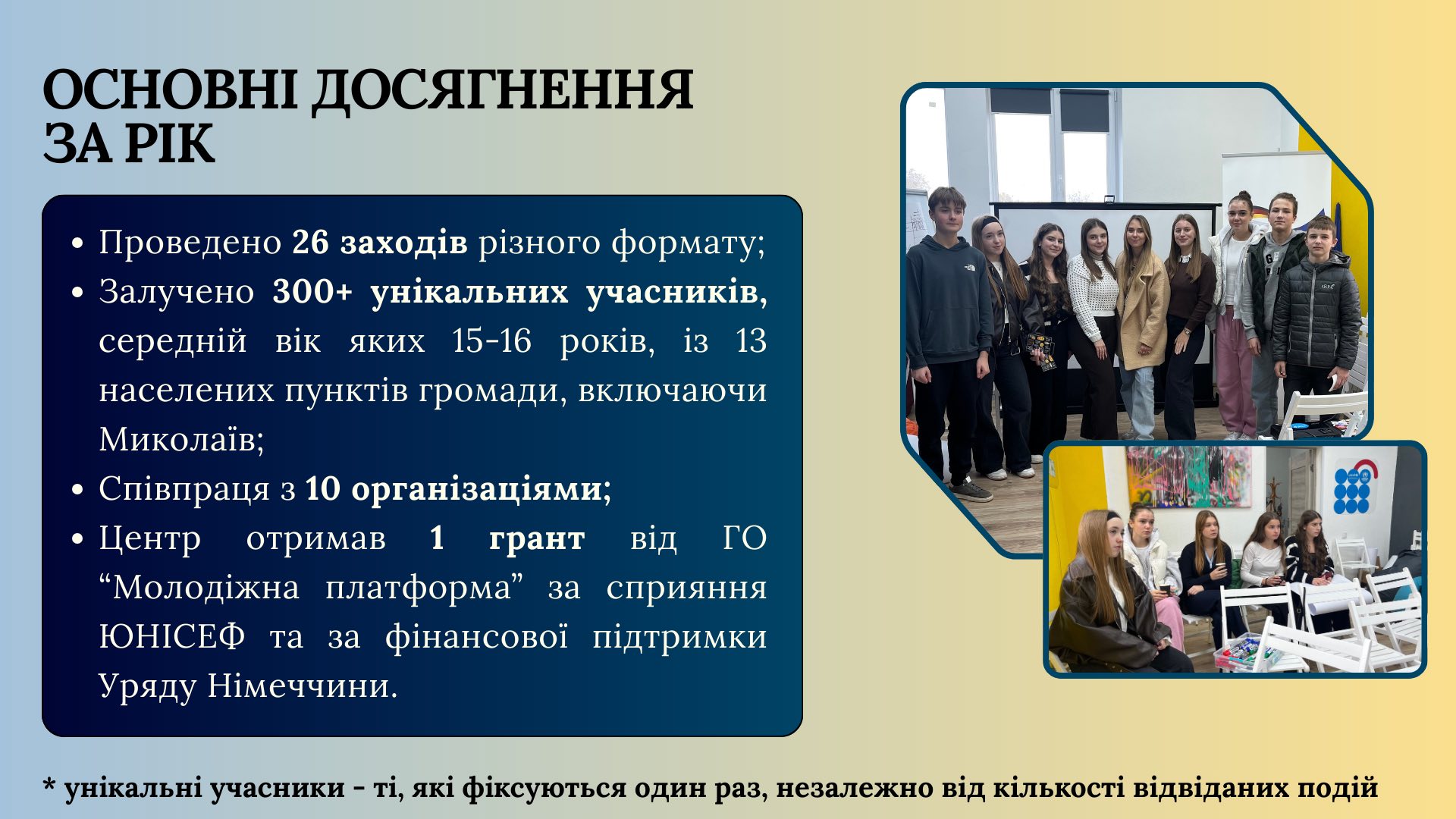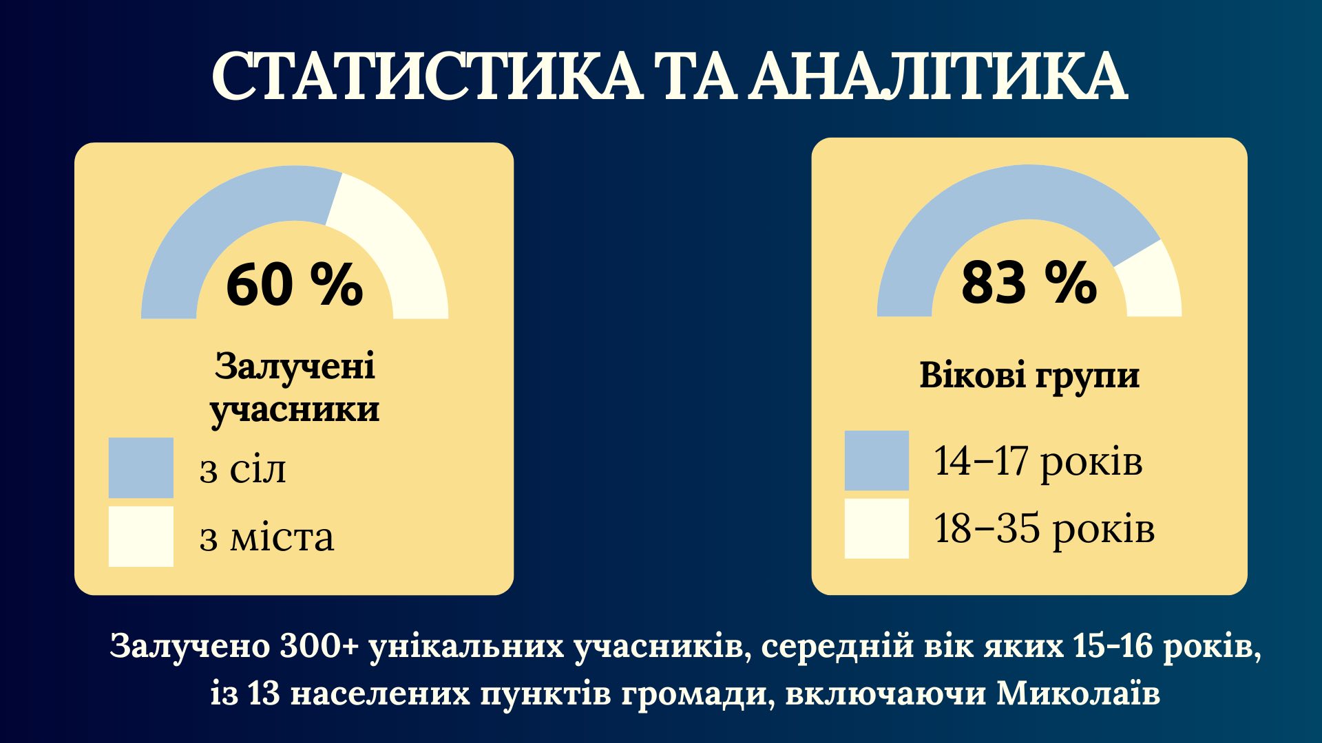 ✅ залучили 300+ унікальних учасників (середній вік 15–16 років) з 13 населених пунктів разом із Миколаєвом;