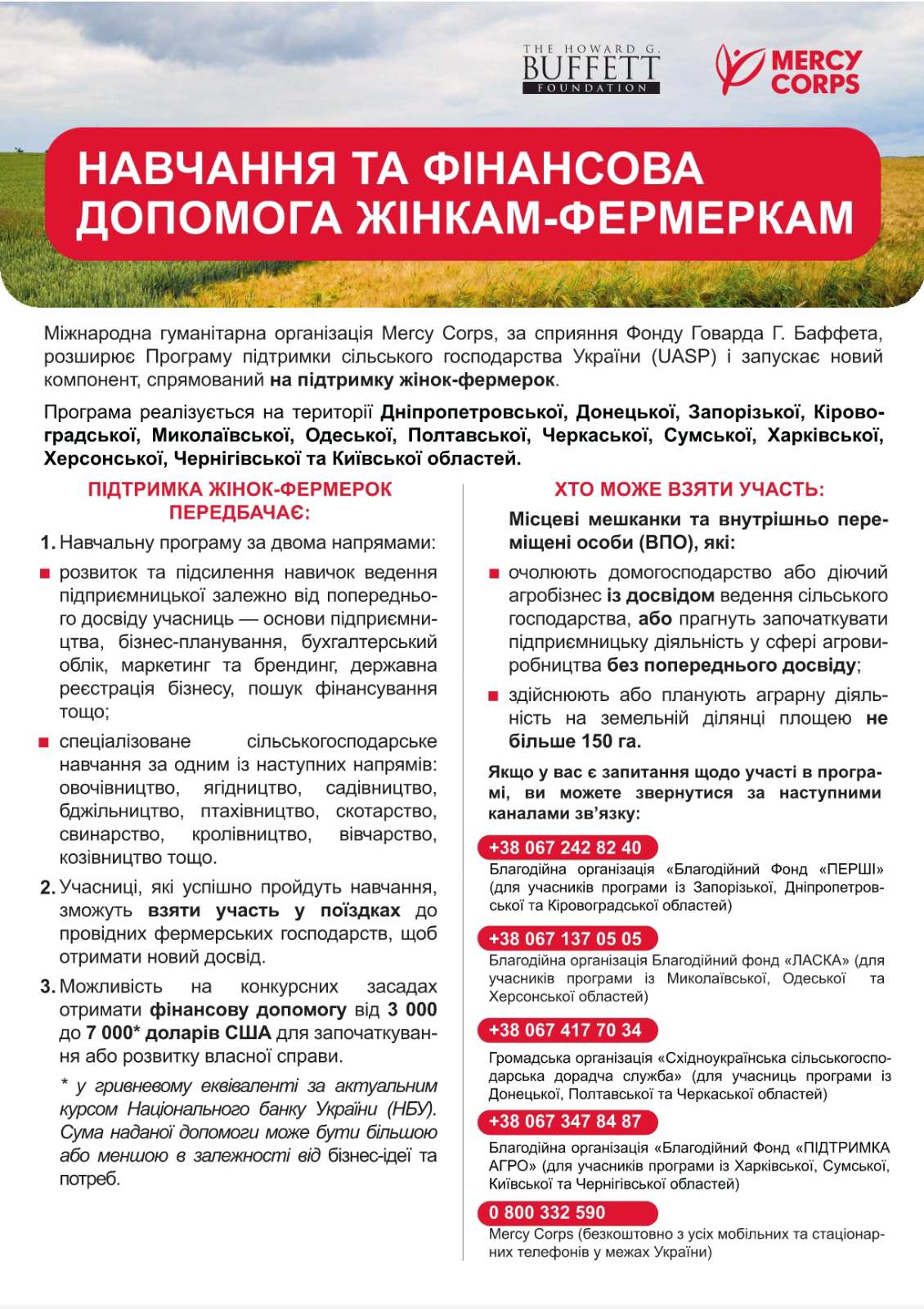 Міжнародна гуманітарна організація Mercy Corps за сприяння Фонду Говарда Г. Баффета розширює Програму підтримки сільського господарства України (UASP) та оголошує набір жінок-фермерок до нового компоненту програми.