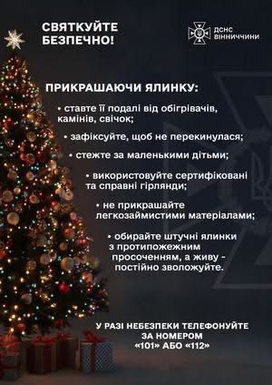 Під час новорічних та Різдвяних свят, стрімко зростає кількість нещасних випадків та пожеж, які виникають внаслідок порушення елементарних правил безпеки при користуванні гірляндами, встановленні ялинок та при користуванні піротехнічними виробами, Вінницьке районне управління цивільного захисту та превентивної діяльності Головного управління ДСНС України у Вінницькій області звертається до жителів району: