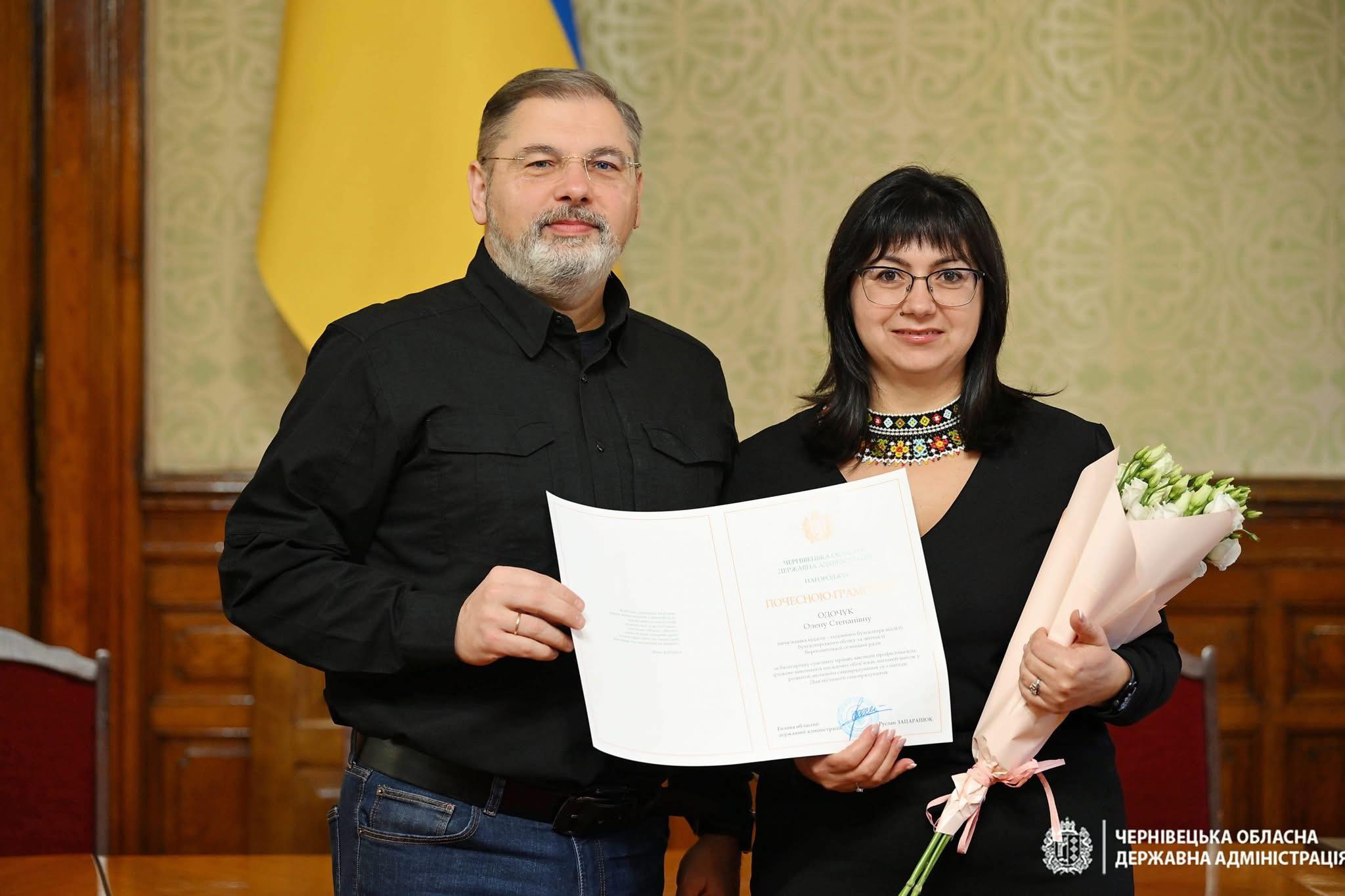 Під час урочистостей до Дня самоврядування голова обласної державної адміністрації Руслан Запаранюк за високу професійність і ефективність відзначив головного бухгалтера Берегометської селищної ради Олену Одочук.