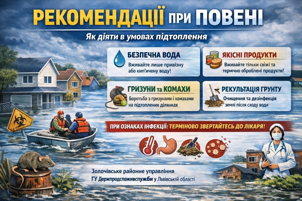 Під час повені зростає ризик інфекційних захворювань через забруднення води, ґрунту та продуктів харчування. Дотримання простих правил допоможе зменшити ризик захворювань.