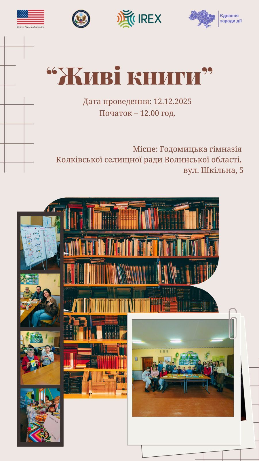 Тренінг «Живі книги» став можливим в межах програми Єднання заради дії, що втілюється IREX за підтримки Державного департаменту США. Тренінг «Живі книги» є виключною відповідальністю ініціативної групи Колківська селищна територіальна громада та необов’язково відображає