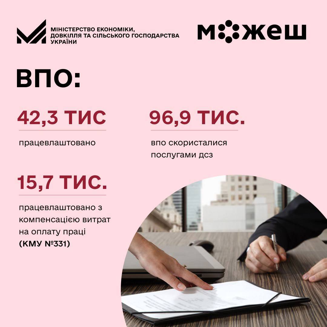 З 1 січня по 29 грудня 2025 року послугами ДСЗ скористалися 96,9 тис. ВПО, з яких 42,3 тис. були працевлаштовані, у тому числі 15,7 тис. — із компенсацією витрат роботодавцям.