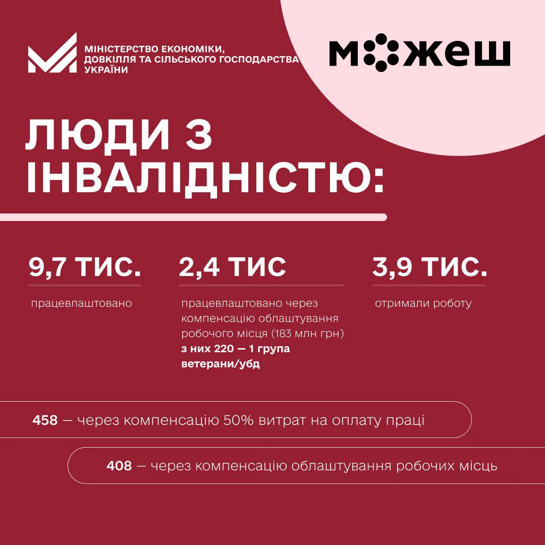З 1 січня по 29 грудня 2025 року послугами ДСЗ скористалися 38,3 тис. осіб з інвалідністю, з яких 9,7 тис. були працевлаштовані. У межах програм підтримки роботодавців за компенсацією витрат на облаштування робочих місць працевлаштовано 2,4 тис. осіб, зокрема 220 осіб з інвалідністю І групи, на що спрямовано 183 млн грн.
