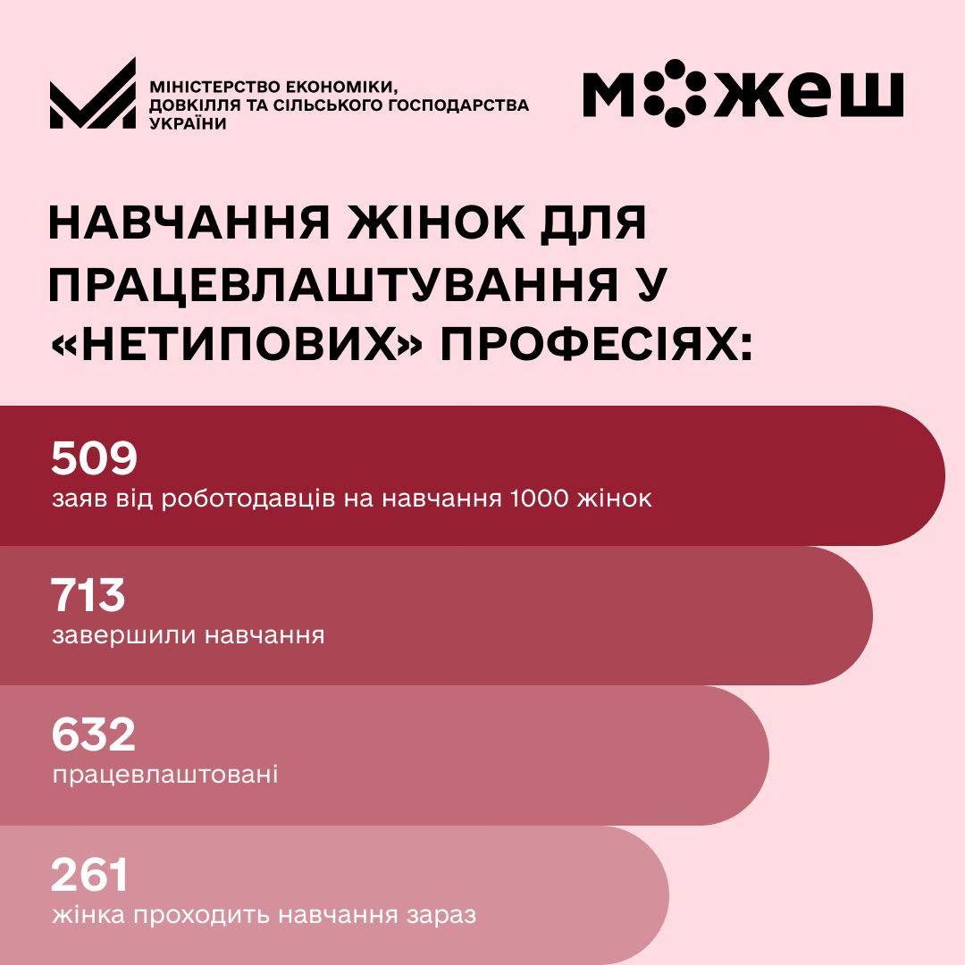 З початку реалізації експериментального проєкту з навчання жінок для працевлаштування у нетрадиційних сферах роботодавці подали 509 заяв на навчання 1 000 жінок; 713 жінок уже завершили навчання, з них 632 працевлаштовані, ще 261 проходить підготовку.
