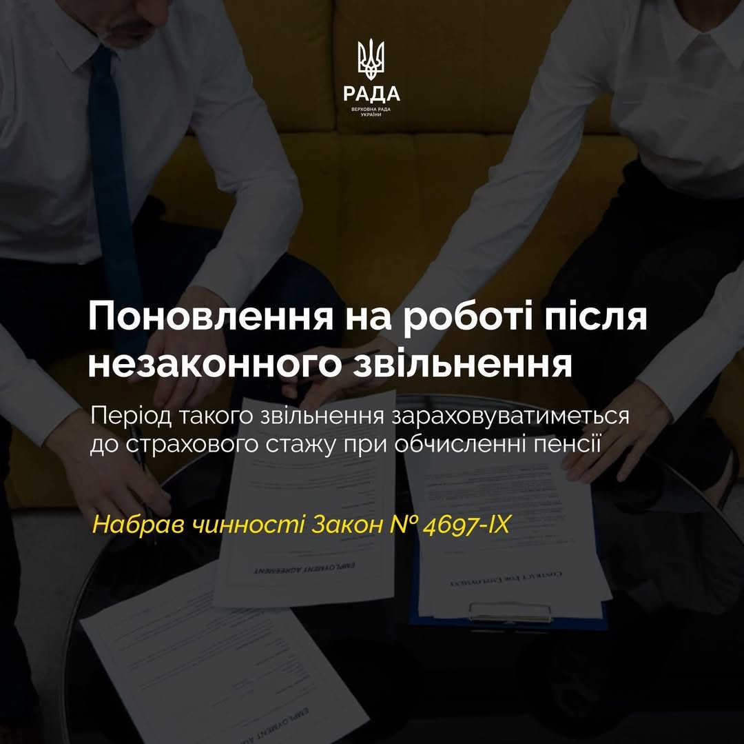 Роботодавець зобов’язаний сплатити страхові внески за весь період незаконного звільнення працівника. Цей період буде зараховано до страхового стажу при обчисленні пенсії. Набрав чинності Закон № 4697-IX.