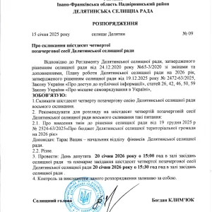Розпорядження селищного голови про скликання чергової 65 сесії Делятинської селищної ради