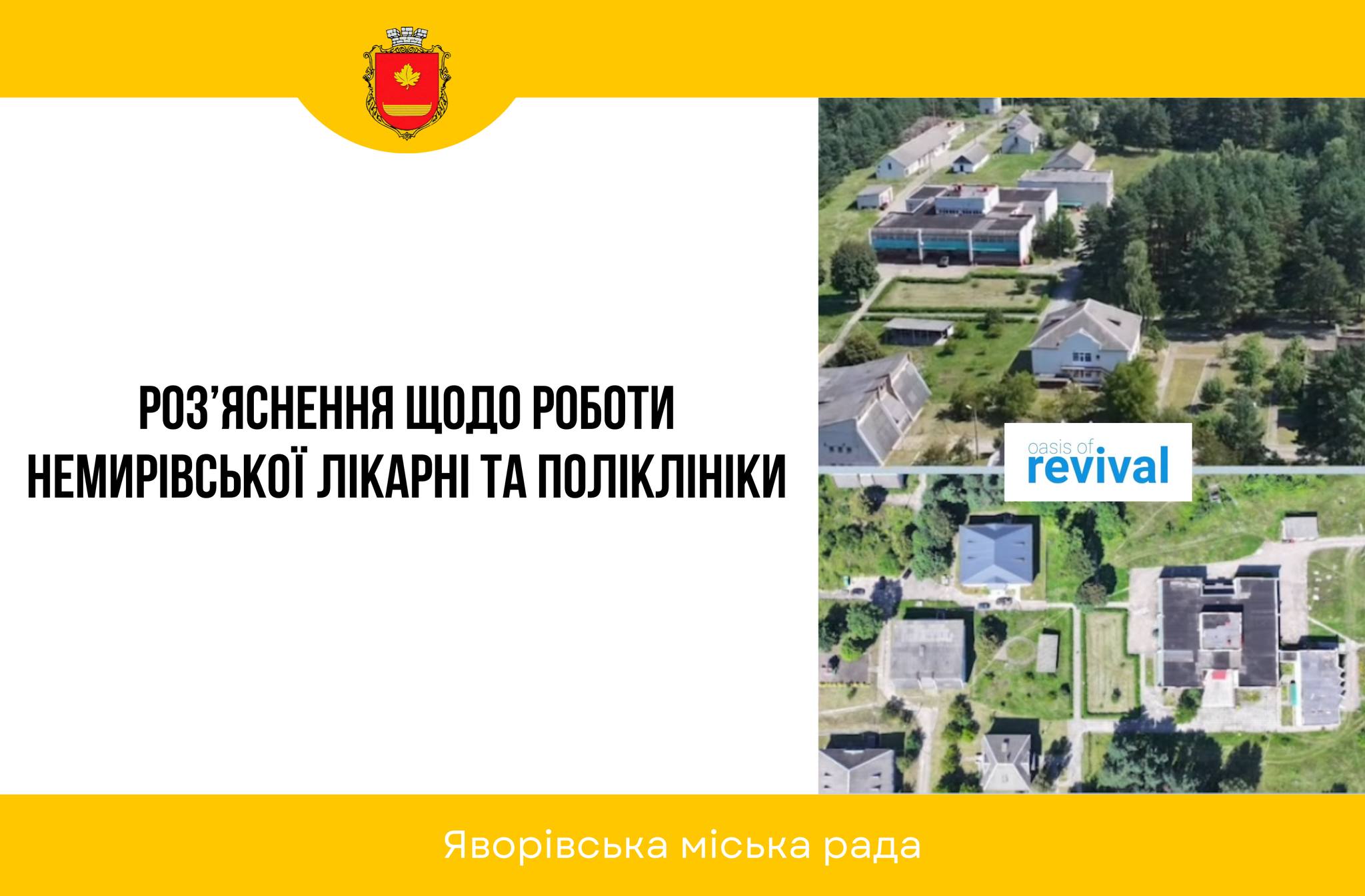 Від імені Яворівської міської ради повідомляємо, що поширювана в соціальних мережах інформація про нібито закриття Немирівської лікарні та поліклініки (амбулаторії) є маніпулятивною та недостовірною.