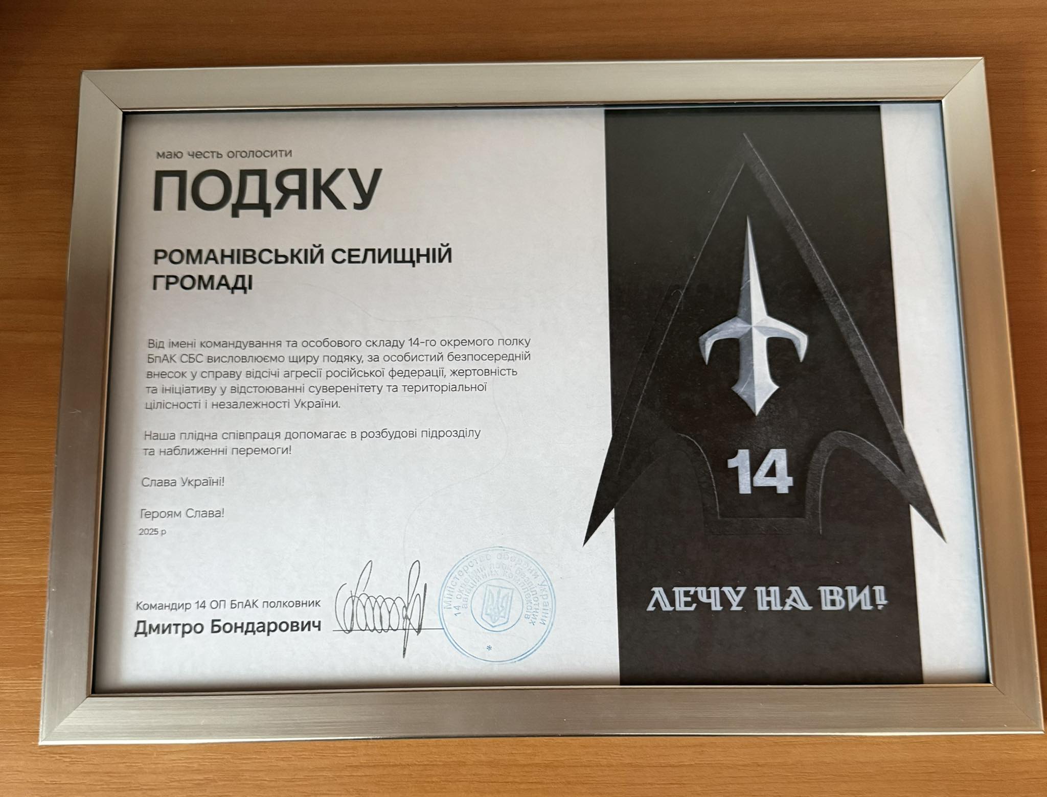 Командування та особовий склад 14-го окремого полку БпАК СБС ЗС України відзначили підтримку Романівської громади, яка сприяє виконанню бойових завдань, зміцненню обороноздатності та наближенню Перемоги.