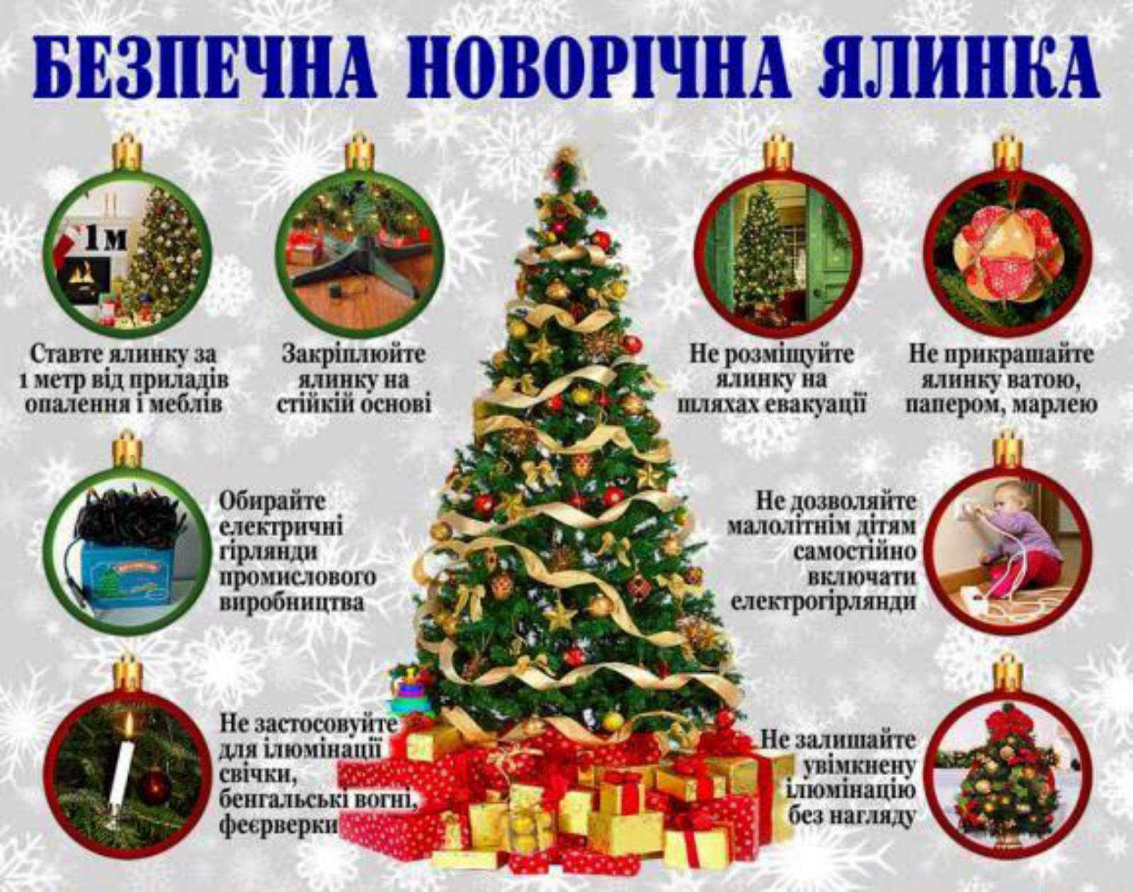 • не запалюйте на ялинці свічки, бенгальські вогні, а також саморобні електрогірлянди);