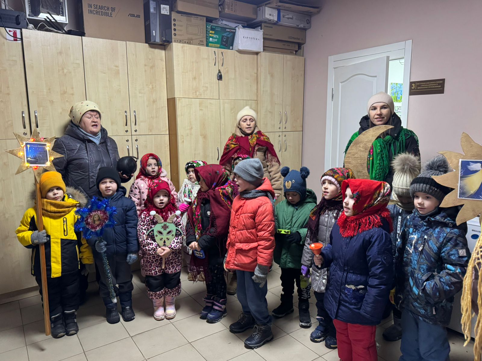 Святково вбрані, в українських хустках та шапках, малята демонстрували свої таланти – зачитали низку колядок та заспівали пісень, бажаючи господарям міцного здоров’я, миру, добробуту та злагоди в їх сім’ях.