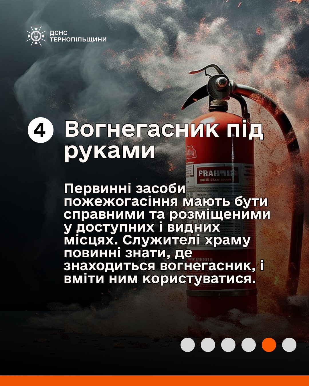 4. Вогнегасник – під рукою. 🧯Первинні засоби пожежогасіння мають бути справними та розміщеними у доступних і видних місцях. Служителі храму повинні знати, де знаходиться вогнегасник, і вміти ним користуватися.