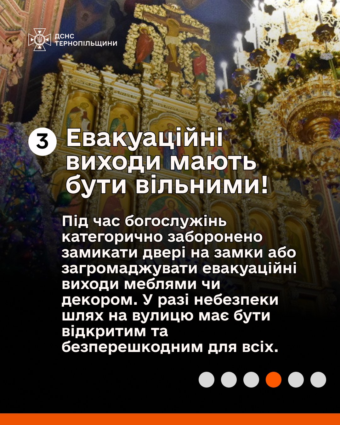 3. Евакуаційні виходи мають бути вільними!🚪 Під час богослужінь категорично заборонено замикати двері на замки або загромаджувати евакуаційні виходи меблями чи декором. У разі небезпеки шлях на вулицю має бути відкритим та безперешкодним для всіх.