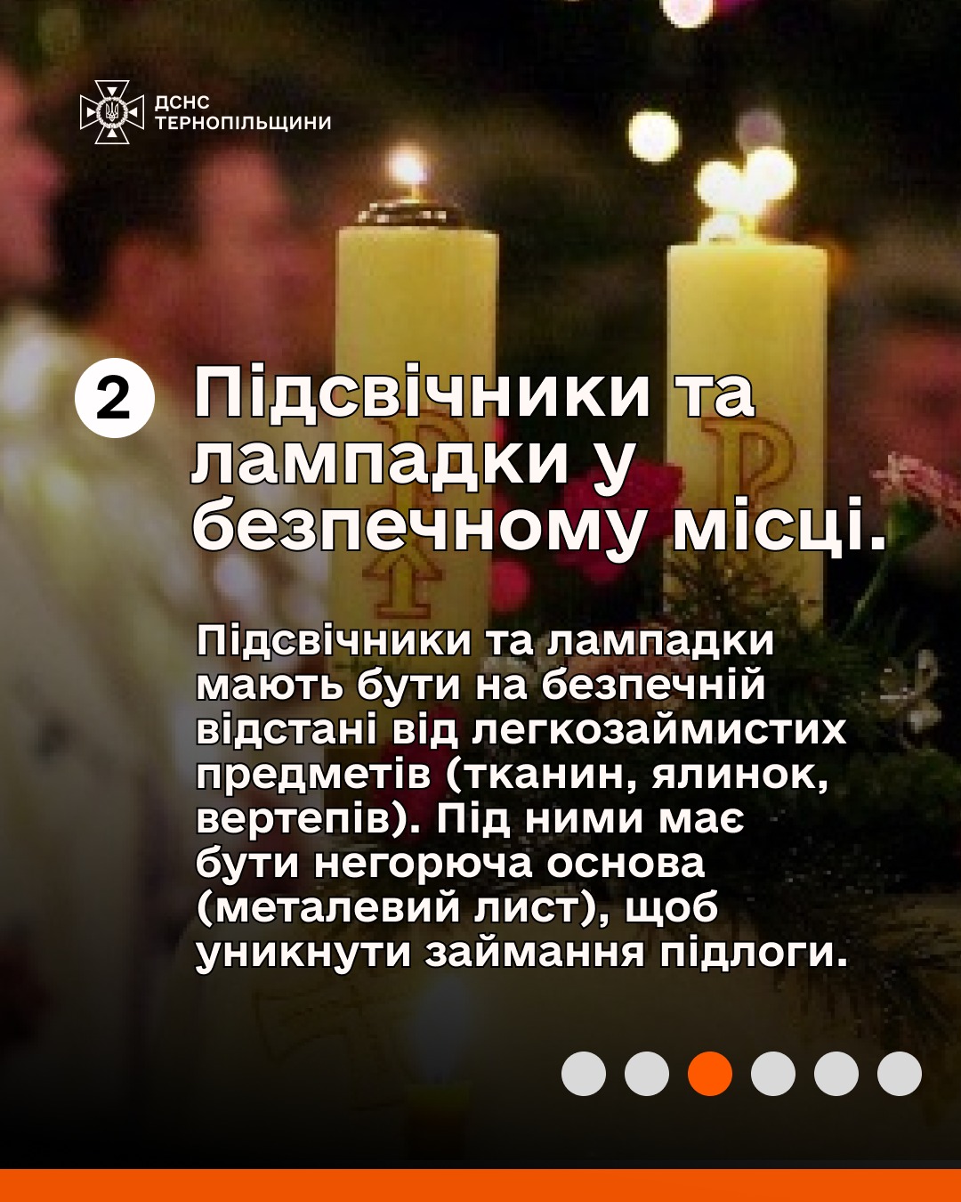 2. Підсвічники та лампадки у безпечному місці. 🪔 Підсвічники та лампадки мають бути на безпечній відстані від легкозаймистих предметів (тканин, ялинок, вертепів). Під ними має бути негорюча основа (металевий лист), щоб уникнути займання підлоги.