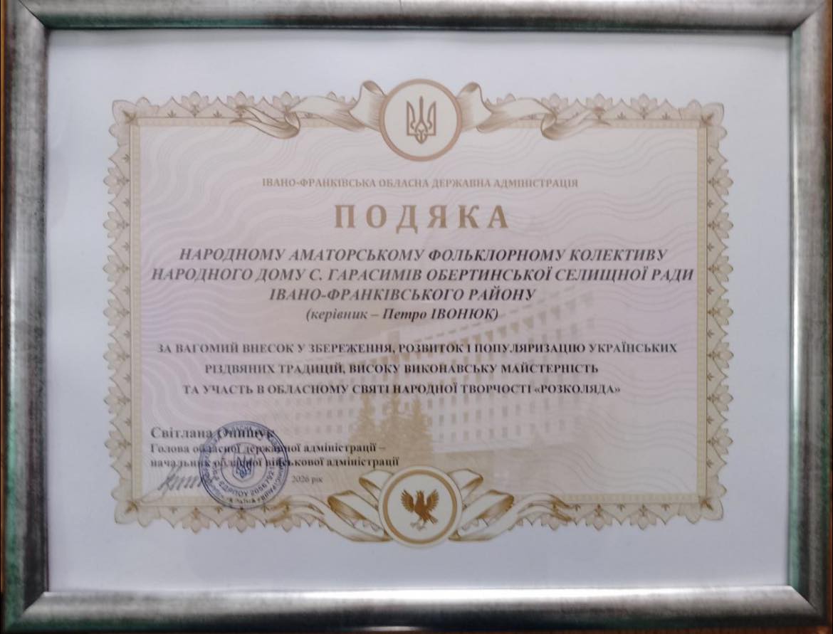 Голова обласної держадміністрації Світлана Онищук відзначила подякою учасників колективу с.Гарасимів та їхнього керівника Петра Івонюка за популяризацію українських різдвяних традицій та високу виконавську майстерність.