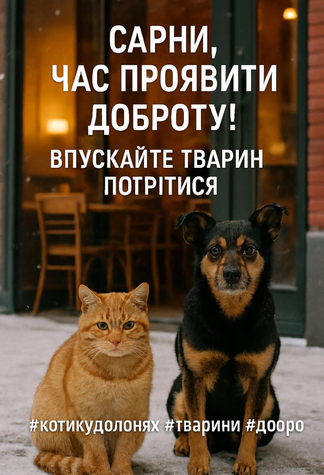 👉 закликати кав’ярні, магазини, бізнес і мешканців міста відчиняти двері для безпритульних тварин у холодні дні.