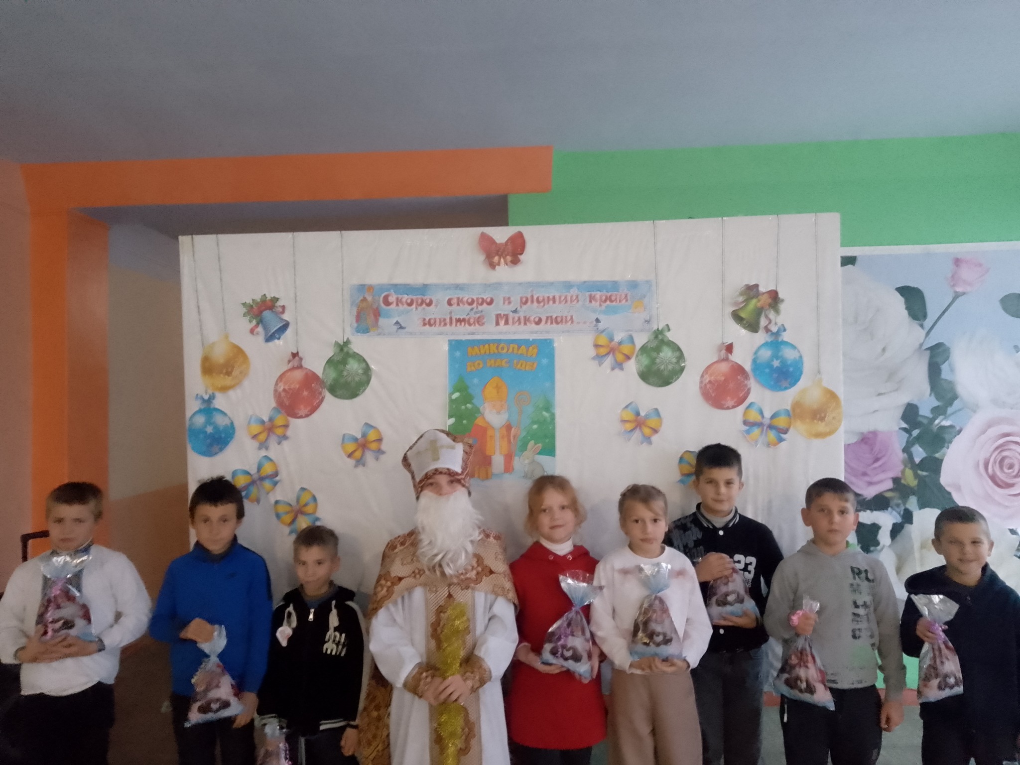 Святий Миколай привітав учнів, похвалив за їхню доброту, слухняність та досягнення протягом року. Він побажав усім здоров’я, миру, сімейного затишку й здійснення найзаповітніших мрій. А найприємнішим моментом для учнів, звичайно ж, стали довгоочікувані подарунки, які додали ще більше чарівного настрою до нашого свята.
