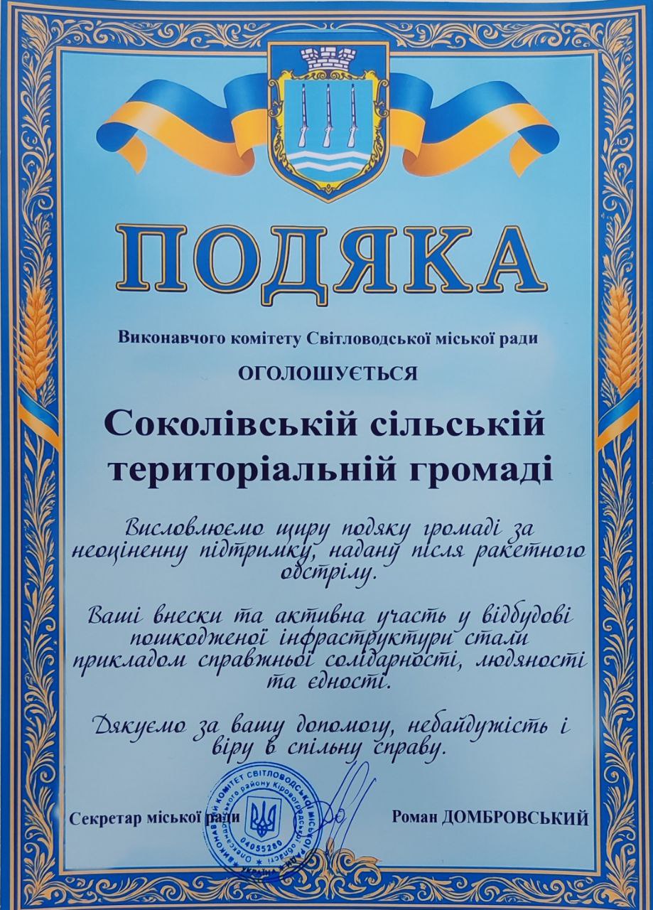 “Висловлюємо подяку громаді за неоціненну підтримку, надану після ракетного обстрілу. Ваші внески та активна участь у відбудові пошкодженої інфраструктури стали прикладом справжньої солідарності, людяності та єдності. Дякуємо за вашу допомогу, небайдужість та віру у спільну справу!” – йдеться у подяці жителям Соколівської громади.